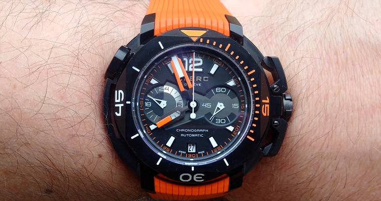Instead they thought about it and worked out that most recreational sports or diving wearers wouldn’t need a chronograph to measure more than 60 minute segments, so they added a double main second-hand to show the elapsed chronograph time. The white hand on top shows the seconds with an orange hand directly underneath showing the minutes on an orange minute track running round the edge of the dial, a very ingenious complication. The date is shown in a small window at 6 O’clock with nice legible black on white numerals. Pushers for the chronograph are located at the normal positions of 2 & 4 O’clock however Clerc have fitted pushers that hinge out from the centre crown giving a nice symmetrical feel.