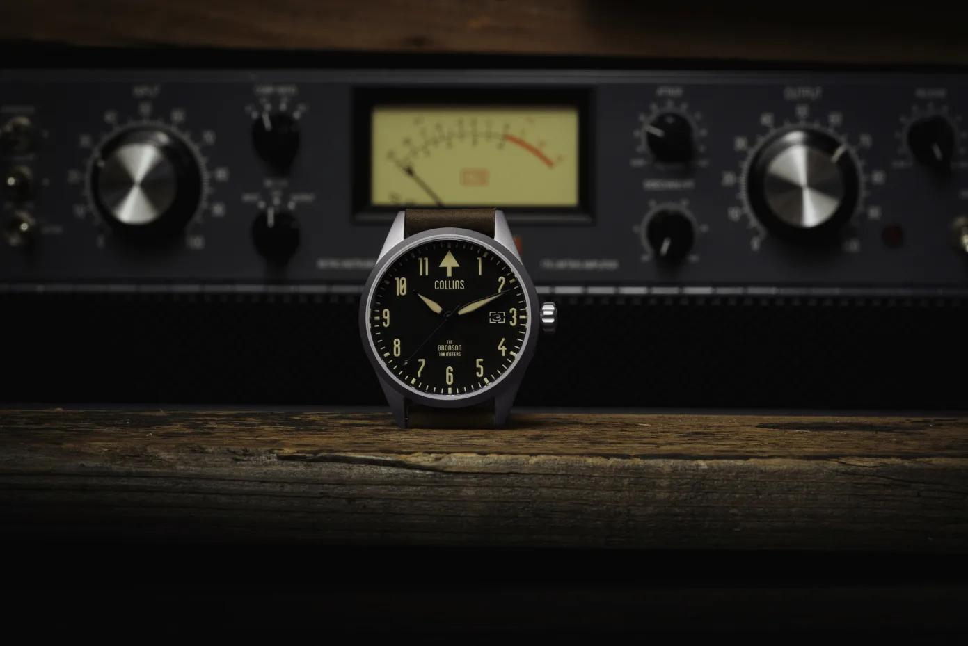 The Collins Watch’s classic styling is further enhanced by its leather band with a custom “Collins” imprinted buckle, as well as a printed emblem on the inside of the leather. The aged look of the strap adds a subtle ruggedness to the watch. They are also offering quality nylon Zulu bands.