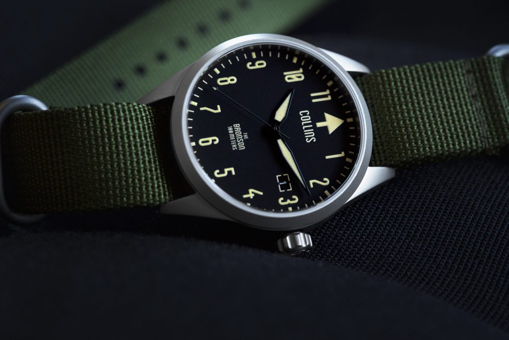 The Collins Watch’s classic styling is further enhanced by its leather band with a custom “Collins” imprinted buckle, as well as a printed emblem on the inside of the leather. The aged look of the strap adds a subtle ruggedness to the watch. They are also offering quality nylon Zulu bands.