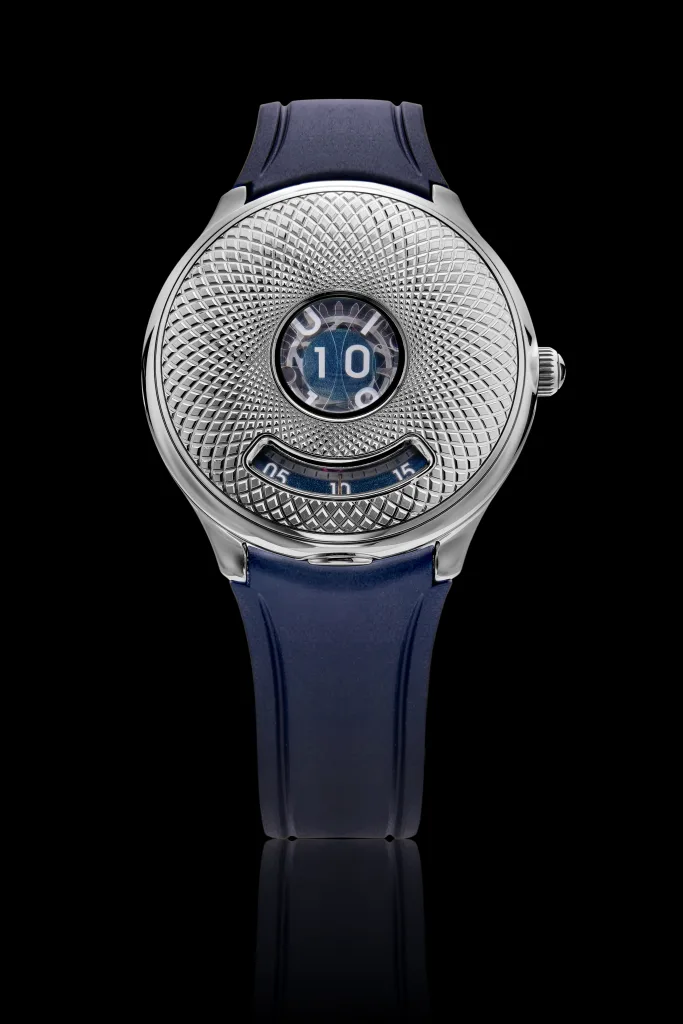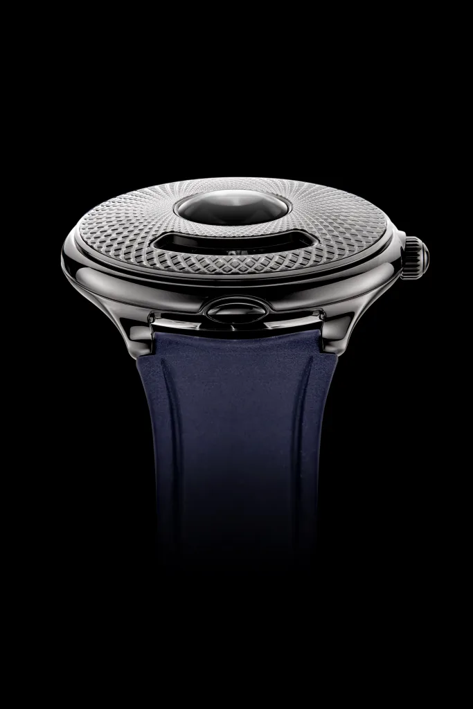 The hours are displayed by a patent-pending system using disks in the centre with a magnifier over them, with another window at the bottom showing the passing minutes. A three-dimensional guilloché pattern is cut into the top, evoking the traditional look of old pocket watches to counteract the futuristic time display. The 40.50mm x 12.35mm case is also quite futuristic, with its side profile resembling a flying saucer. Water resistance is rated at 30m.
