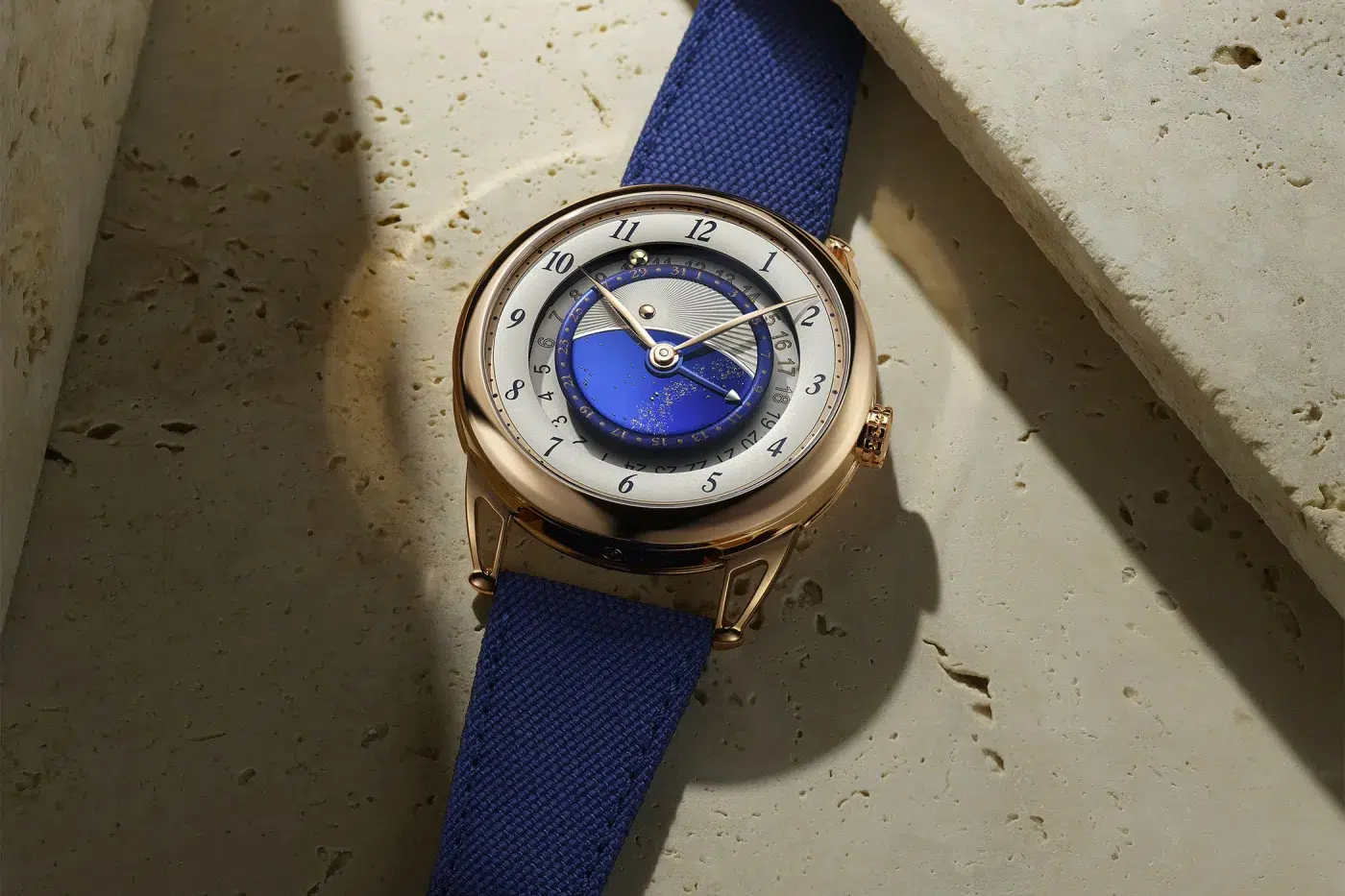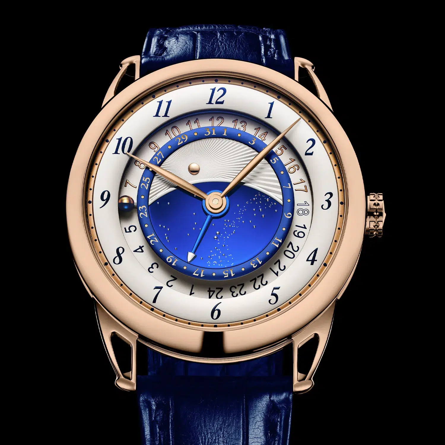Hailed by the brand as “the ultimate travel companion”, the DB25GMT Starry Varius is part of the DB25 family, a travel watch dressed in a 5N rose gold case while sizing at 42mm x 11.8mm. The dial has a starry sky complication in the center, surrounded by three concentric rings that show the local time, home time, and date. De Bethune’s approach to GMT watch is that the local time is displayed with pink gold hands on a silver flange with classical Arabic numerals. The home time is indicated by a rotating rose gold and blued steel sphere, and also serves as a day/night indicator.