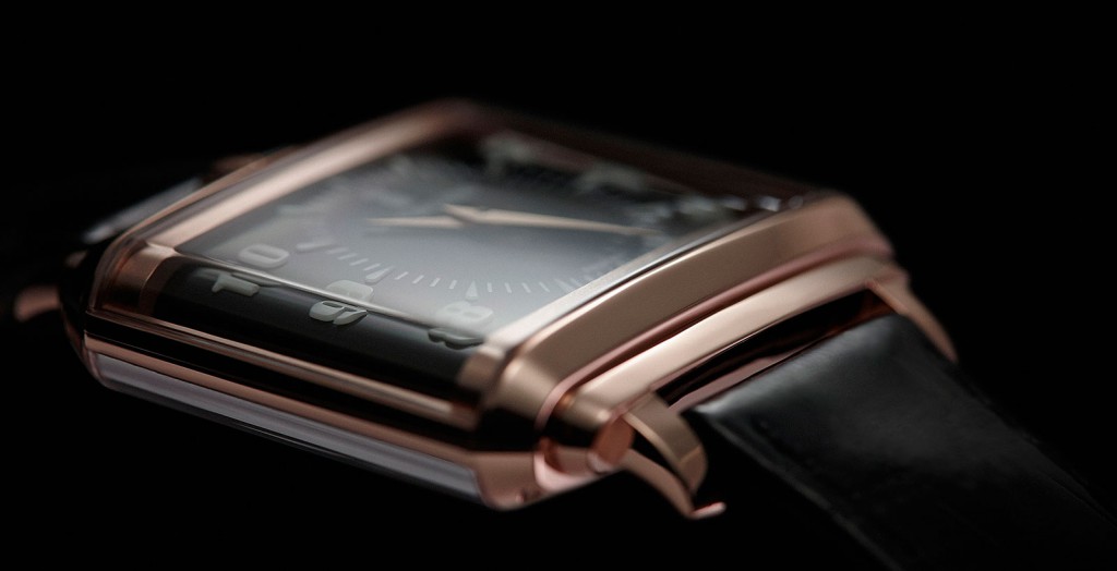 The warm glow of the rose gold case is not of vintage size but a much more modern interpretation with the case measuring 50mm across an 40mm top to bottom. Two identical sapphire crystals hug the front and back of the piece with curved ends that don’t quite meet on the case, the flanks are smooth and linear but also give the wearer an unobstructed view of the movement. The dial is a deep black with only 2, 3, 4, 8, 9 and 10 numerals on it so it’s not cramped by trying to add all numerals and, therefore, keeping with the vintage look. The crown has been moved to the 12 O’clock position giving the piece even cleaner smooth lines.
