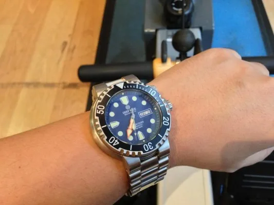 The bezel is uni-directional with 120 clicks. It measures a slightly smaller 43 mm with lume pip at zero/60 minute position.