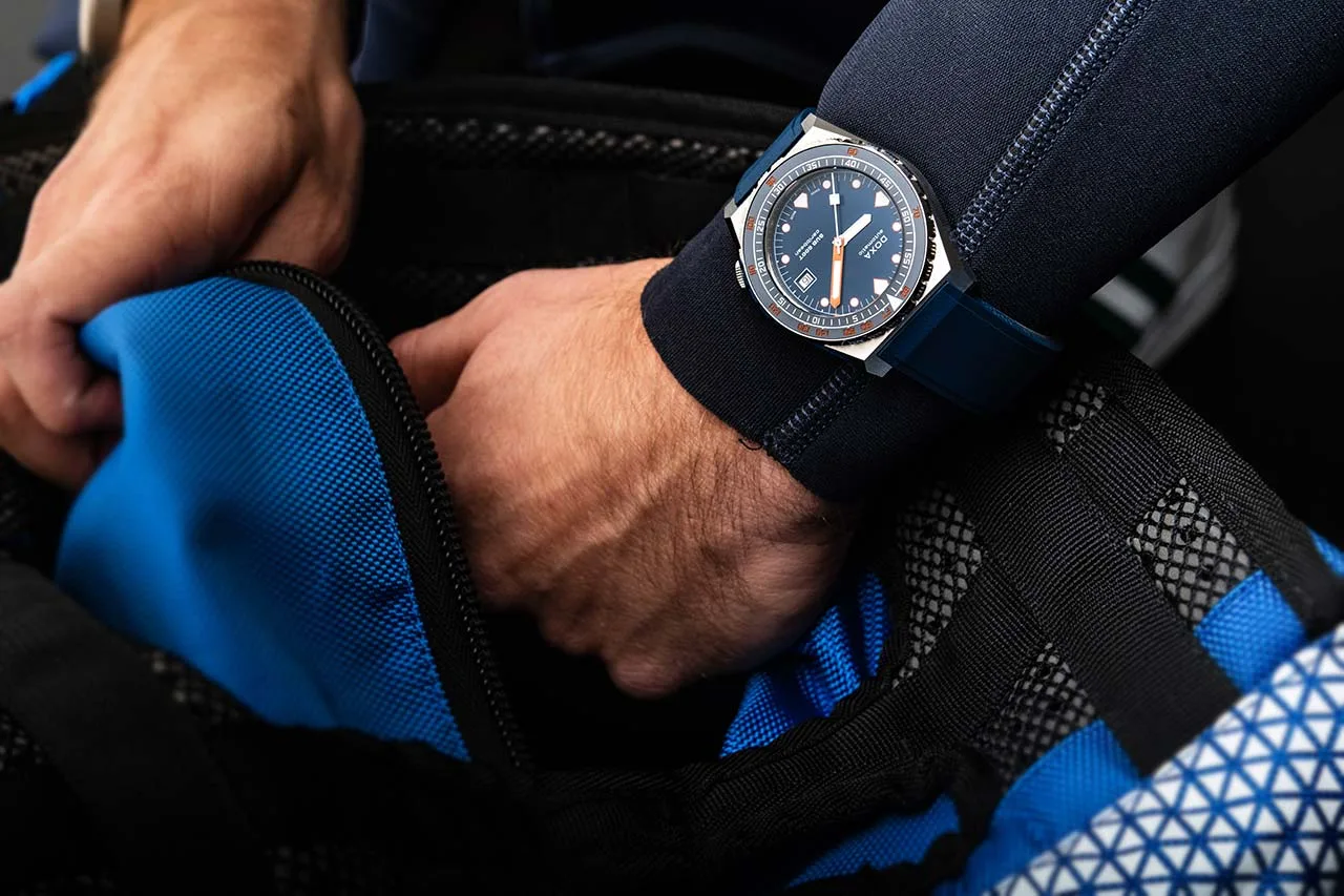 The stainless steel case is very wearable at 40mm in diameter with a thickness of 14.15mm (47.6mm lug-to-lug). In Doxa style, it’s built like a tank and has a water resistance rating of 600 meters. That’s more than anyone could descend other than professional saturation divers. Sharp angles and a bold polished chamfer give it a distinctive look, along with the flat screw-down crown that’s offset at 4 o’clock (Seiko 5 vibes). The unidirectional diver’s bezel goes beyond the basics, relaying both dive time in minutes (inner ring) and depth in feet (outer ring). Doxa holds a patent for this design, which allows divers to calculate immersions without decompression stops. A black ceramic insert is available for all models, except for the blue dial that has a matching blue insert. The solid case back has a relief of the brand’s fish logo, which is also on the crown. As expected for such a piece, a sapphire crystal protects the dial.
