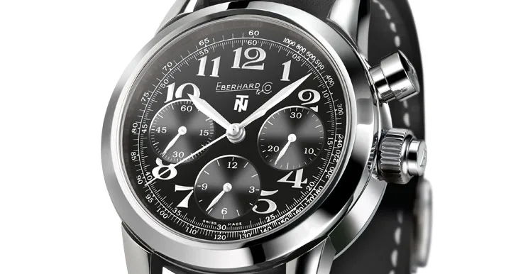 With a superbly refined self-winding movement (30 rubies, blue screws, perlage and Côte de Genève finishing) guaranteeing at least 42 hours of autonomy, the new Eberhard & Co. chronograph has the classic trio of counters for hours, minutes and a second hand sweep; arabic numerals and hands are white.