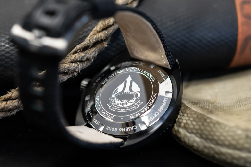 Inside the watch is the calibre 80, an automatic movement based on either an ETA 2824 or Sellita SW200, depending on stock levels. The movement has a 4Hz beat rate, as do both of the ebauches it’s based on, and a power reserve between 35 and 40 hours. Covering the caseback is a depiction of a scuba diving helmet as well as some engraved text.