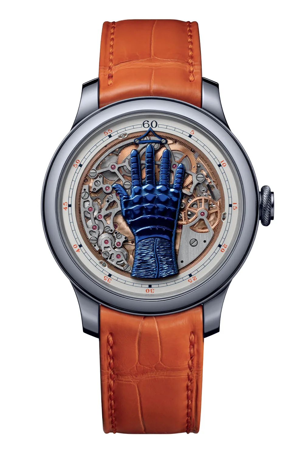 Let me begin by saying that the F.P. Journe FFC Blue is the quirkiest and boldest F.P Journe I have ever seen. Featuring a centrally mounted blue hand on top of a highly open-worked movement, this is a watch that exemplifies an ingenious new take on timekeeping. When I first looked at the pictures of the watch, the only bit I could immediately figure out was that the minutes can be tracked using the combination of a floating blue marker and the railroad-style minute track on the outer periphery, but I was clueless about the hours could be tracked using just one hand with five fingers.