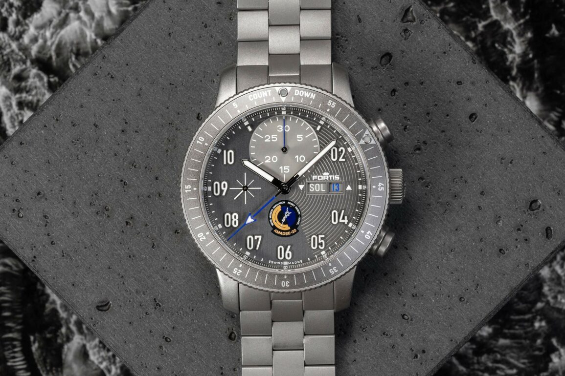 The Fortis Cosmonauts Amadee-20 is a handsome watch full of interesting details, but it is the dial that steals the show here. Presented in a steel gray color, the dial is characterized by applied double-digit black-bordered numerals that have been generously filled with luminous paint and bring forth a nice sense of depth. To further heighten the visual interest, Fortis has given the dial a nice mix of finishes. The base dial features a combination of vertically brushed lines and semicircular grooves, that represent the orbit of Mars with its natural axis. And finally, the recessed chronograph minutes counter at 12 gets a sunburst finish. It is also worth mentioning that while the watch uses a familiar 6,9,12 layout, the chronograph hour register at 6, has been replaced with the Amaade-20 mission patch. Completing the dial is a day and date display with a color-matched wheel. For the hands, Fortis has gone with lume filled black swords for hours and minutes, batons for the sub-registers, and an arrow-tipped chronograph hand. The chronograph hands have been painted blue to add a little bit of zing to the dial.