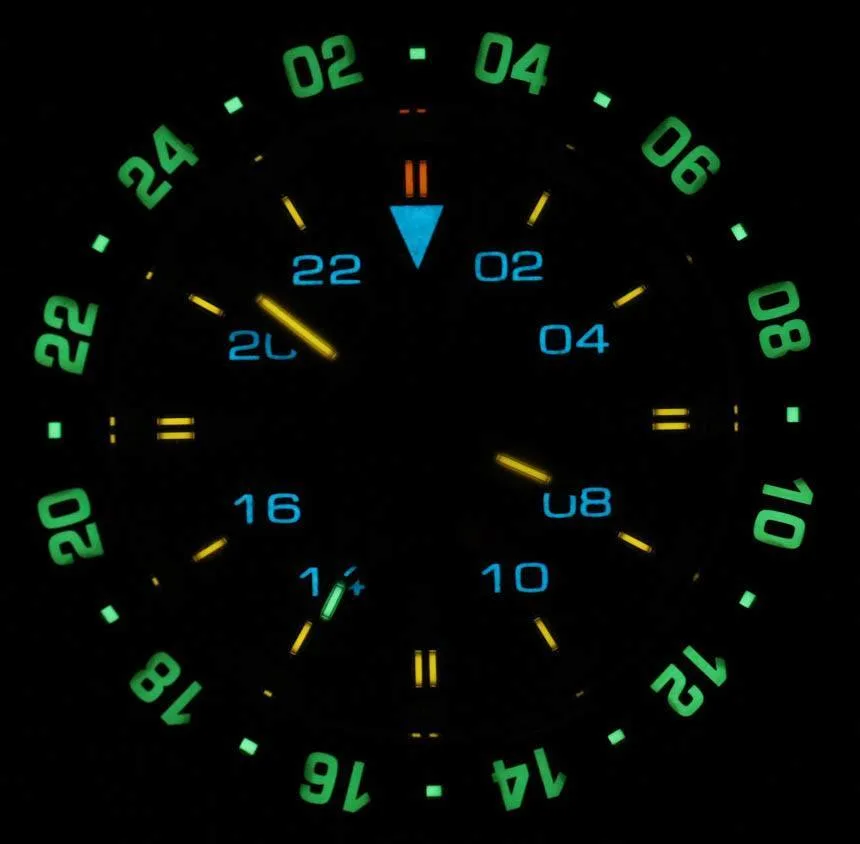This watch comes alive in the dark. I relish every time there were opportunities to be in such an environment. The tritium tubes are like magic in the dark. The illumination is just spectacular. The AeroGMT has 43 tritium tubes. Not only on the dial (18 tubes) but for the first time ever, Ball has applied tritium gas tubes to the numbers on the GMT bezel (25 tubes). Unfortunately, I could not get a perfect picture of the illumination with my camera. However, the photo below which I got from the internet reflects what I see on my watch. In the light, the AeroGMT is just black and white; in the dark, it becomes a multicolour tool with blue, green, orange and yellow.