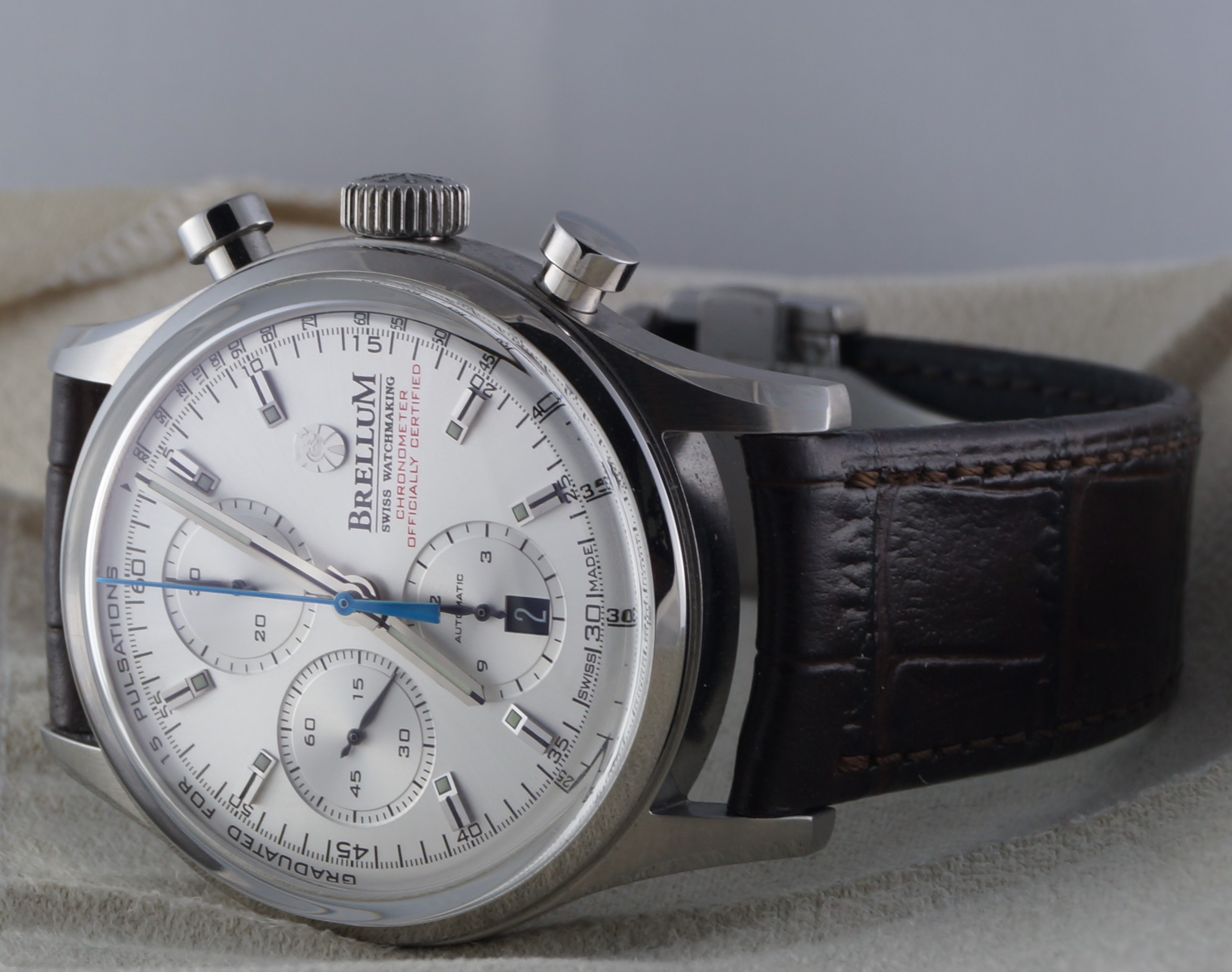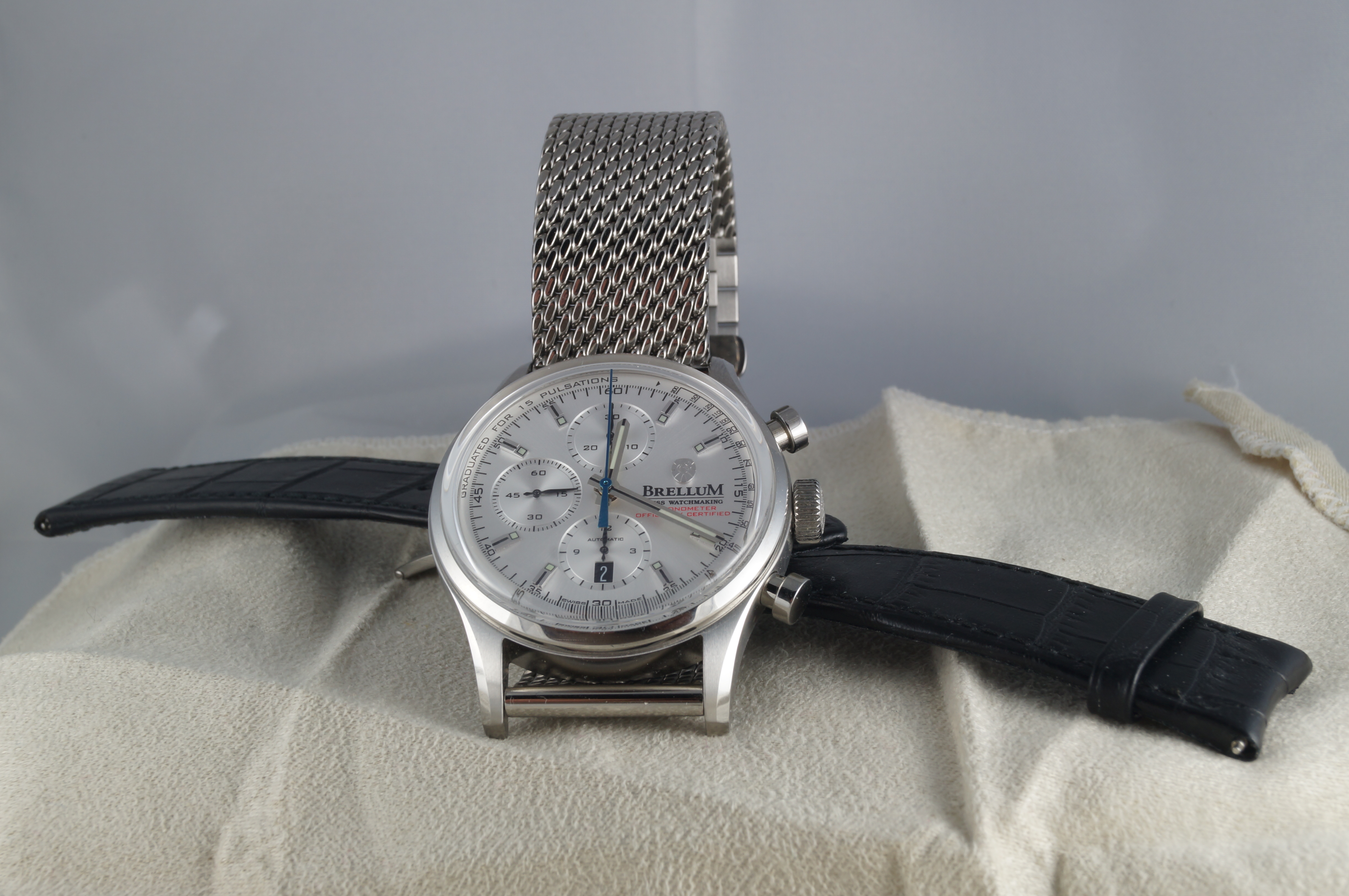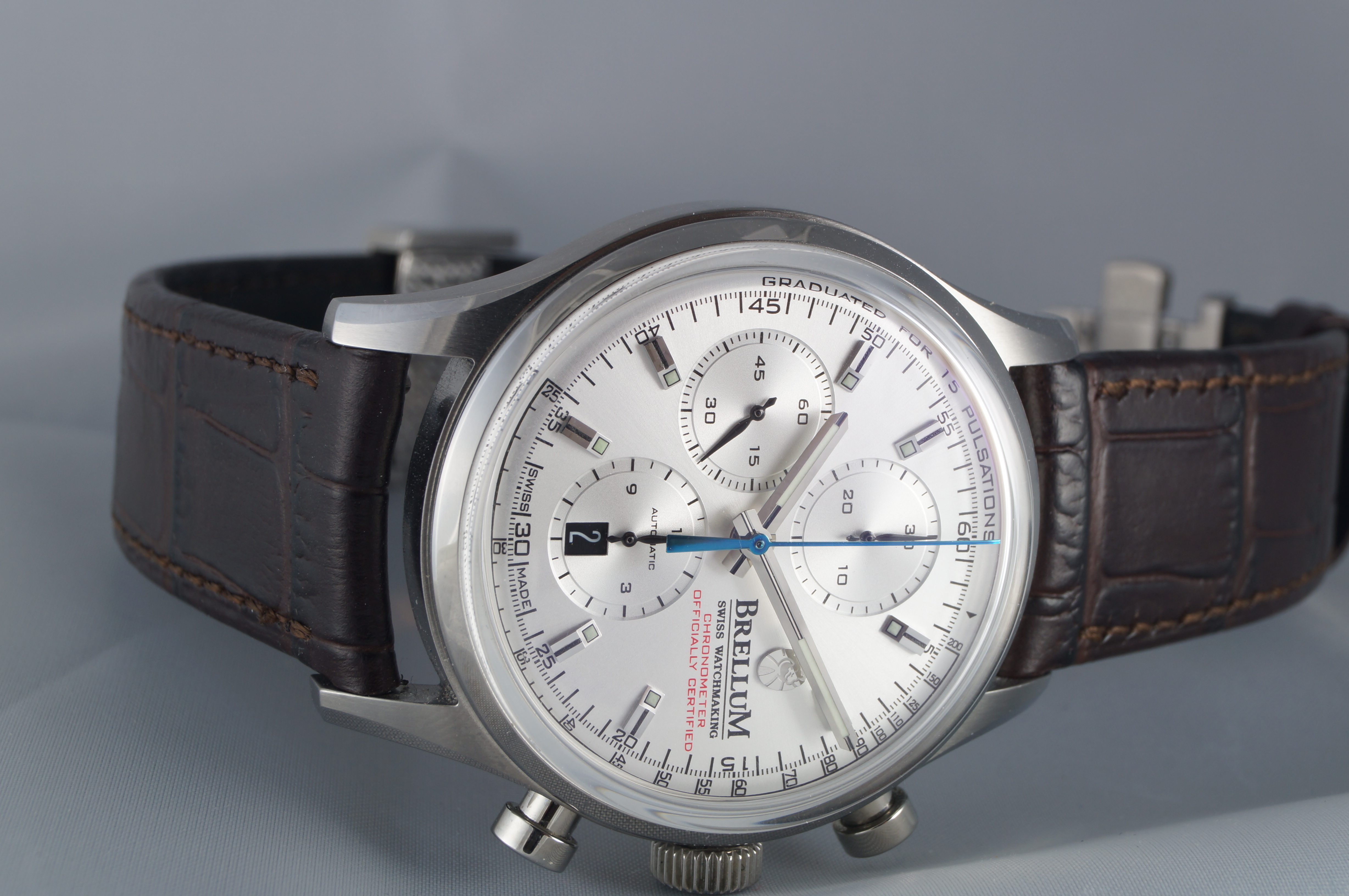 Furthermore, the Brellum Duobox Chronometer Chronograph Watch comes in various models: Silver dial, black or brown leather strap Silver dial, Stainless Steel Bracelet Grey Meteor dial, black or gray leather strap Grey Meteor dial, Steel bracelet Deep Blue dial, blue or brown leather strap Deep Blue dial, steel bracelet.