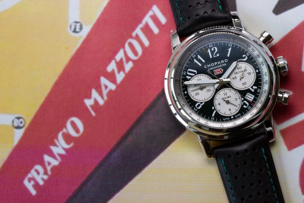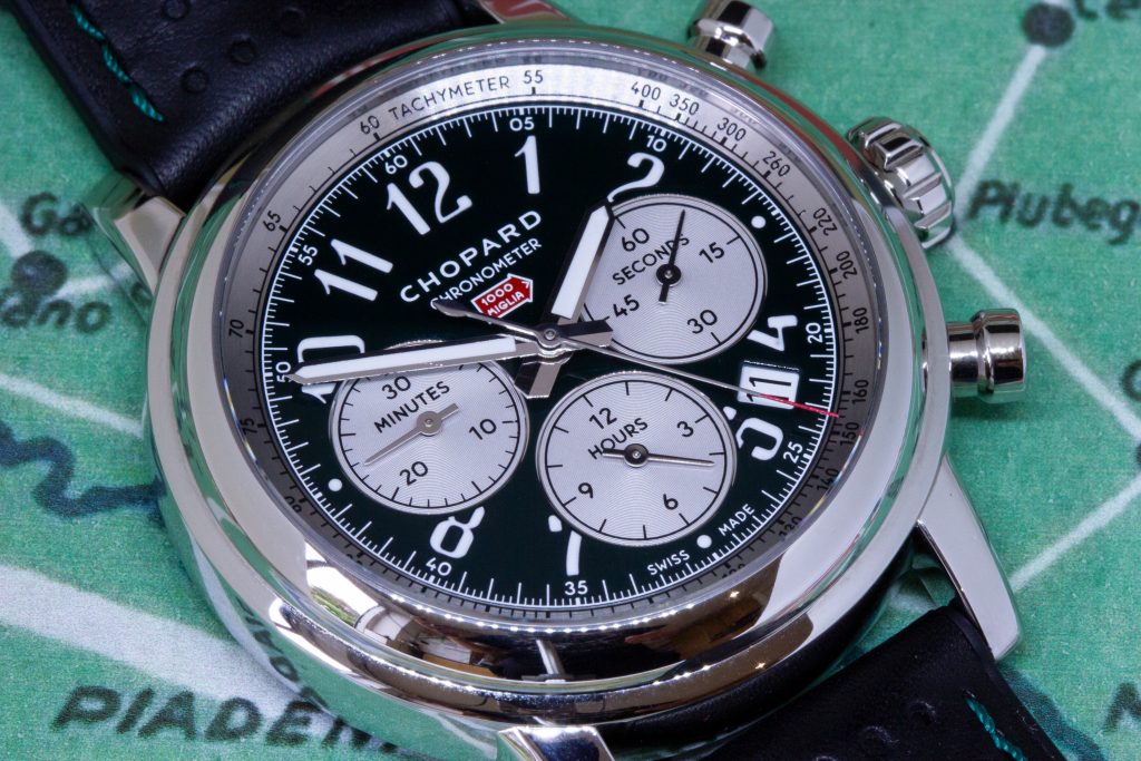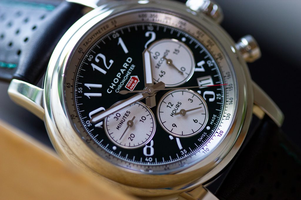 Now I can wax lyrical about the decoration on this watch all day, but I know there are some stats geeks out there waiting with their pen and paper for the numbers, so here we go. As mentioned, the case is 42mm in diameter and made of polished 316L stainless steel. The movement is a chronometer grade ETA as mentioned, with an operating frequency of 4Hz, or 28,800 vph and has 37 jewels. The chronograph on this watch is modular and can record up to 12.5 hours, it is not a column wheel actuated chronograph, nor is it a flyback. The case of the watch keeps the movement dry down to a depth of 50 meters, but we do not recommend submerging this watch in water, please see our Lexicon page for more guidance on water resistance. This is a limited edition watch, and all colours are limited to just 300 examples available from Chopard boutiques for a price of $6080 or £4730.