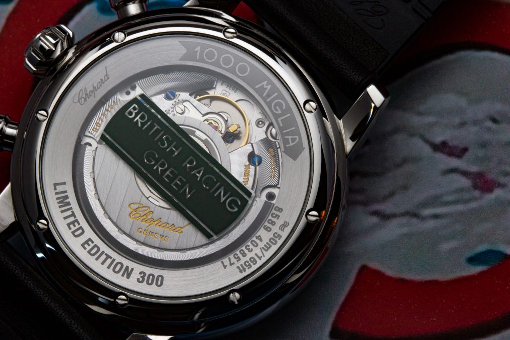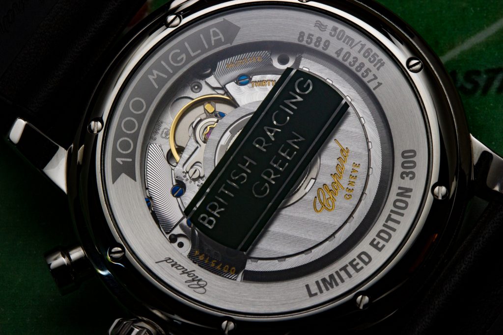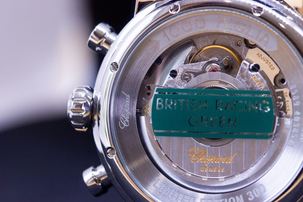 I don’t consider this a downside, but it’s worth a mention that Chopard likes to print stuff on the crystal covering the movement, we’ve seen them do this before such as with the Superfast Porsche 919 edition. In this case, each racing variant has a name associated with the colour on the back; this one has ‘British Racing Green’ on it. While the movement is nicely decorated for what it is, it’s still an ETA, so I don’t consider it to be a huge loss concerning viewing experience, you can still see most of the movement behind there. Chopard also uses the trick where it sits the movement in a bowl with a silver ring around it to make the movement look bigger, and to good effect in this case. In this instance, if you really were unhappy with the print on the crystal, then you could go with the standard black dial, and you likely wouldn’t be able to tell the difference apart from a strap change. But, the other colours are more obvious, so if you want the yellow, for example, you’ll have to put up with the print.