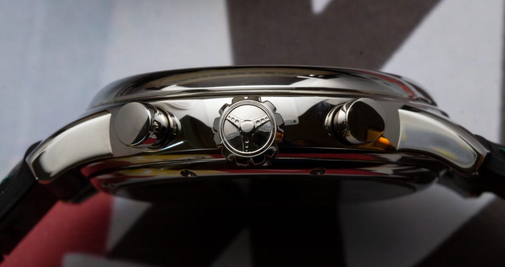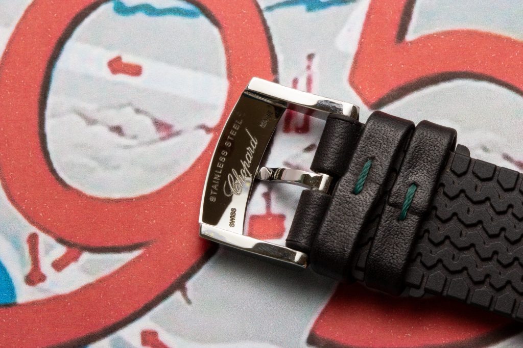 I have to say, it managed each one with ease. The high polished case meant that under a shirt cuff it looked the part, the case is nicely rounded and quite slim considering it’s a chronograph watch. The leather strap is quite nice as well when paired with the watch. It’s rubber on the underside with tyre track sweat grooves, but on the top, it’s a piece of smooth leather with decorative stitching. It’s quite odd at first, feeling rubber but seeing leather, but you get used to it. When wearing this watch with a t-shirt the 42mm case size means it’s quite large, and the polishing helps emphasise the diameter of the case. The chronograph pushers help too, and the crown is decorated with a design resembling the steering wheel of a classic sports car. The stainless steel clasp is big and chunky too, with the pin buckle design having Chopard written on it, but instead of the usual engraving it has been extruded, to look like it’s been forced out of the metal by some supernatural spirit. Also, that stainless steel case is hefty, giving it a luxurious feel befitting of the Chopard name. I’ve held one of these 42mm Mille Miglia watches before, but I also held the 46mm 2016 XL edition at the same time, so I guess I never noticed until I got to try one on its own.