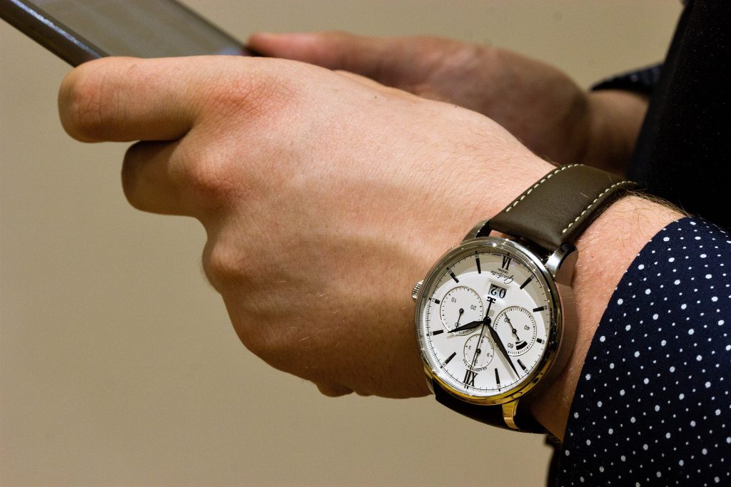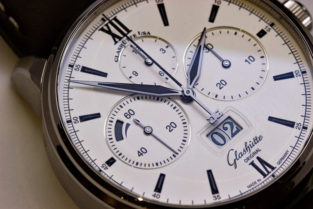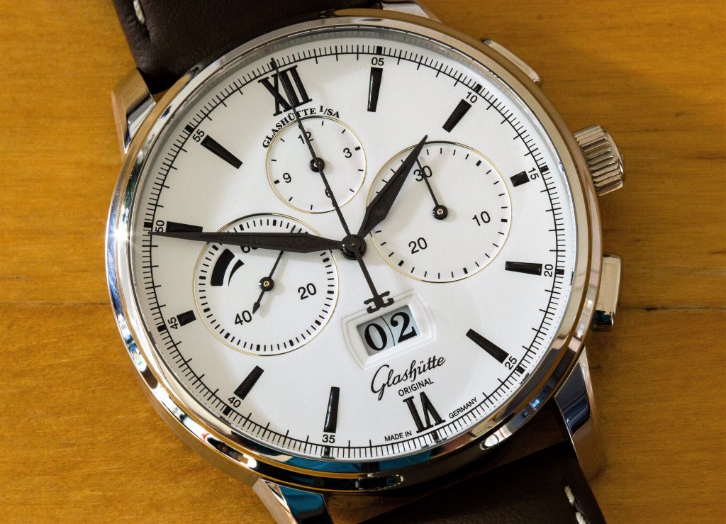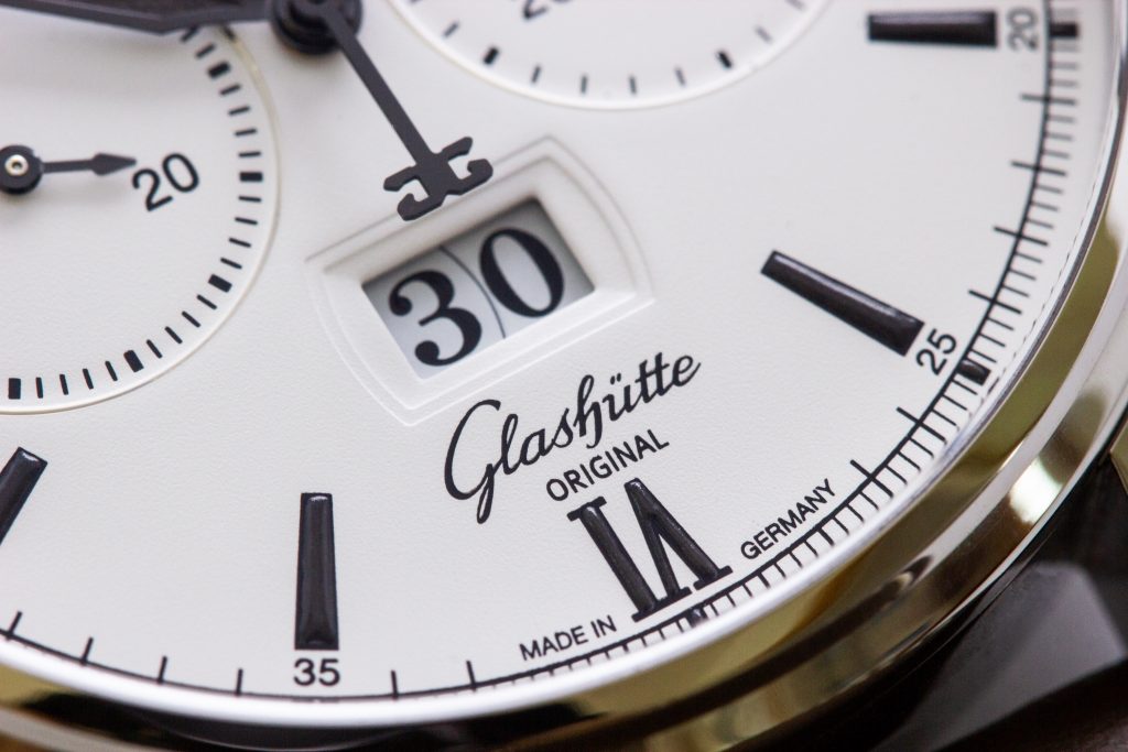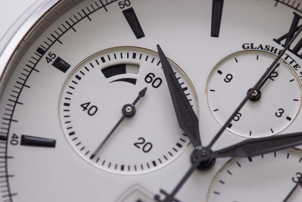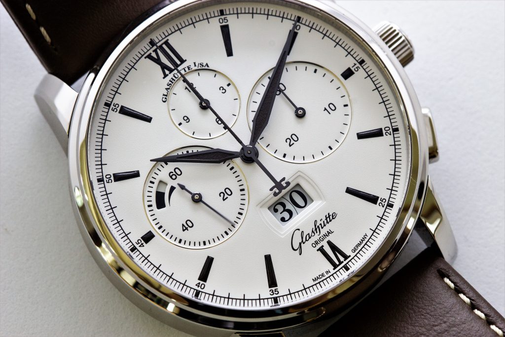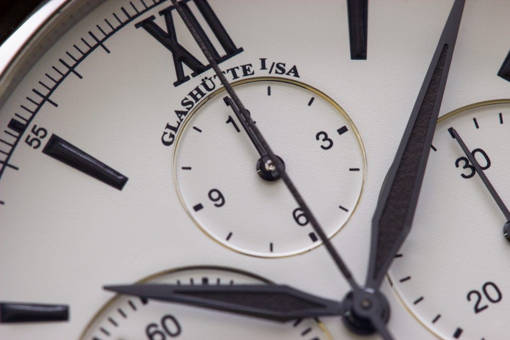 I’m going to start the review by talking about the dimensions and wearability of the watch. Usually, I leave that until nearer the end, but I think it is important here as it was my first experience of a Glashütte Original watch. When you first pick it up you’ll find that it’s very heavy. The stainless steel case is a large 42mm in diameter, but it’s thick compared to a non-chronograph watch, for obvious reasons, more on that below. The case thickness is 14.6mm and polished all over, that brings with it two thoughts of mine: the first is that because it’s all polished up it will attract some attention, and the second thought is that if it gets scratched it’ll show up easily, so I need to be careful! The combination of the brown leather strap, which manages to be both thick and supple, and the varnished matte white dial (made in the Pforzheim factory no less) make for a pleasing and modern look. It’s definitely a heavy watch, both heavy horologically (as in heavy hitting, a technically extravagant piece) and physically, which is due to the complications inside. I’d like to get to try this watch on the bracelet at some point and see whether that balances it out.