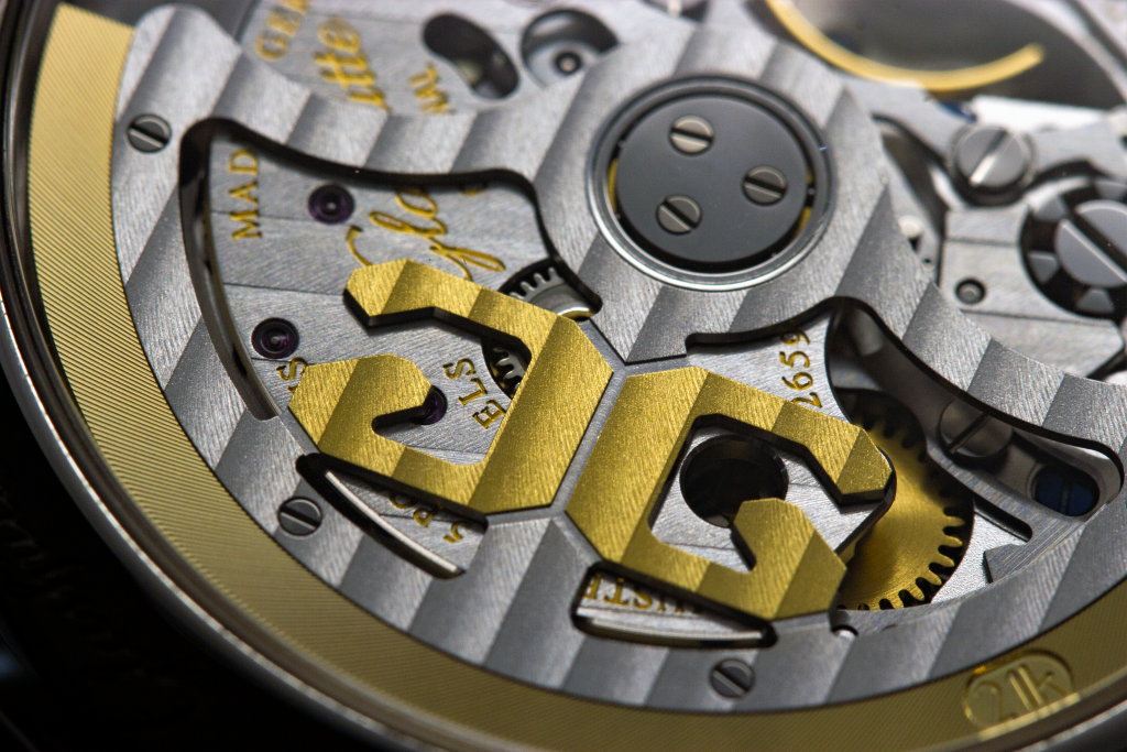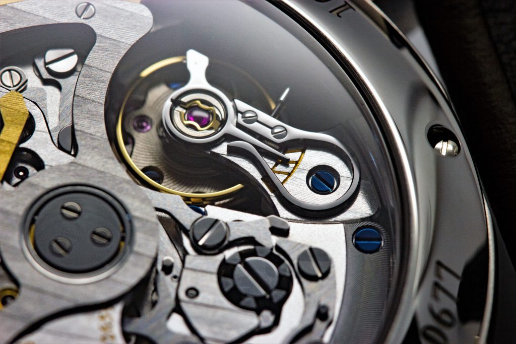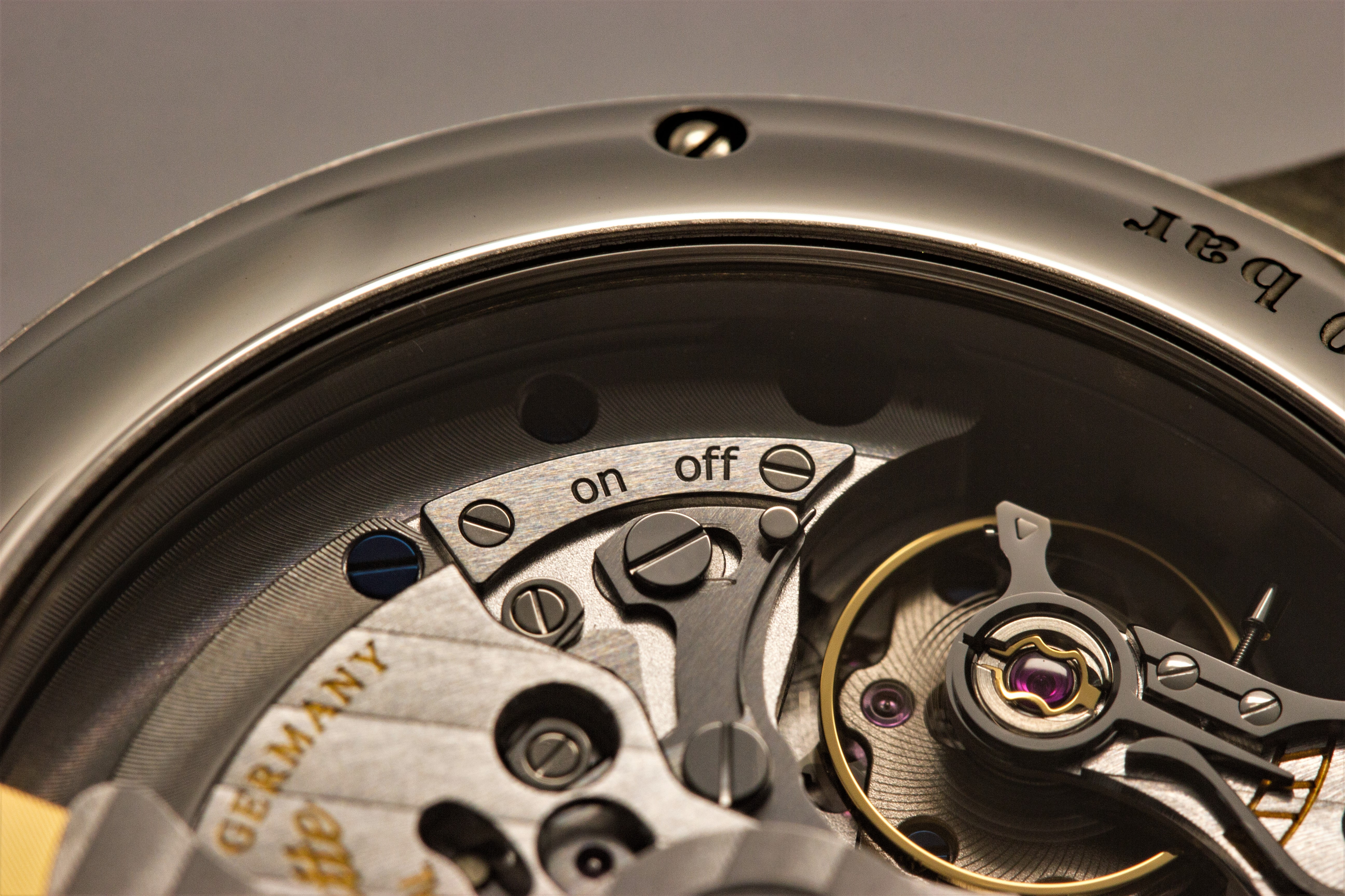 Next, I want to talk about the movement inside. I should first point out that this is an excellent movement in here, we’re talking a fully in-house designed and built automatic winding movement, with a chronograph function, as well as a power reserve indicator and the Panorama date. That would be great on its own, but they go further at Glashütte Original. The automatic Calibre 37-01 movement, operating at 4Hz, features a column wheel chronograph which has been dramatically simplified here. That means that instead of using cams to engage and disengage the chronograph like you might find on old Lemania movements, the chronograph instead interacts with the column wheel, the ‘brain’ of the system. Compared to the cams systems, a column wheel is more reliable, beautiful and also more precise. There is no juddering of the seconds hand before setting off, it just goes.