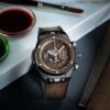 The face of the watch is characterized by applied oversized Arabic numerals that have been outlined in black to offer some contrast to the textured silver background. On the inside of the hour index is a small circular section that comprises the broad skeletonized hands and this area has been slightly recessed to add depth and dimension. On the outer periphery, the flange is marked with double-digit numerals to aid legibility.