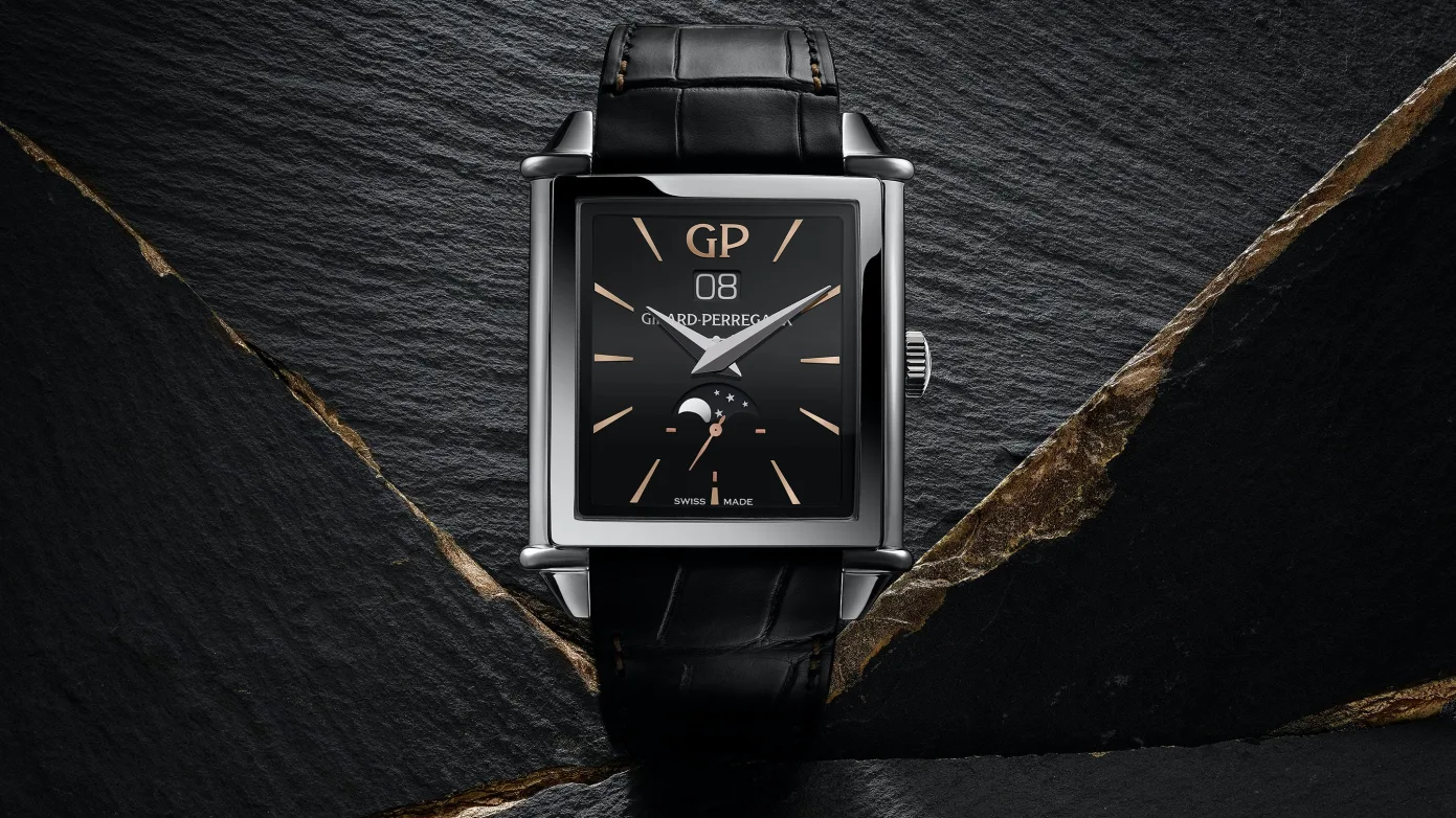 Designed to be as art deco as possible, the 1945 Infinity watch plays on lines and contrasts to flow into one unique package. The sharp case matches the dial which has been kept as fuss-free as possible, allowing the hands, markers, GP logo, date and moonphase to all stand out. The black dial is made of onyx, a gemstone which requires special treatment when turned into dials. Girard Perregaux says that it takes months to make the dial properly and it involves 15 separate operations to do so.