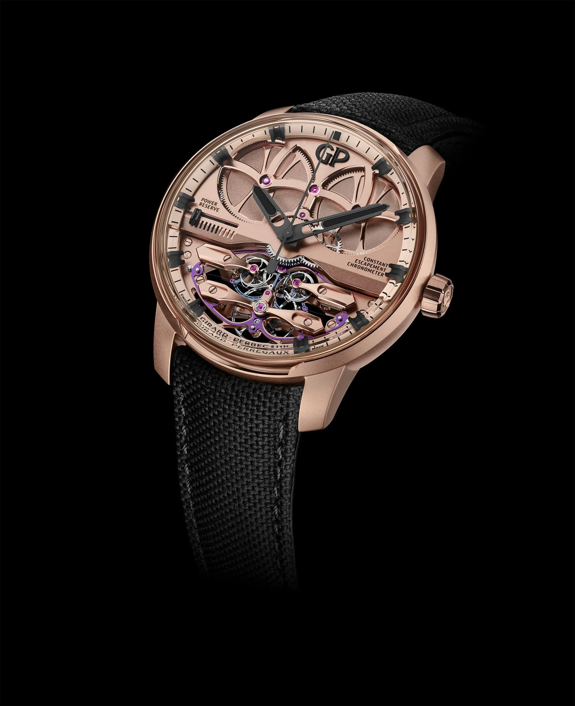 The Neo Constant Escapement Only Watch piece stands out from the rest even on the Only Watch website. It might look like a bronze timepiece, but this special piece is actually made of 18k pink gold in the case and dial which has been sandblasted. It’s an unusual choice for this material, given that brushing and polishing are traditional, but it works.