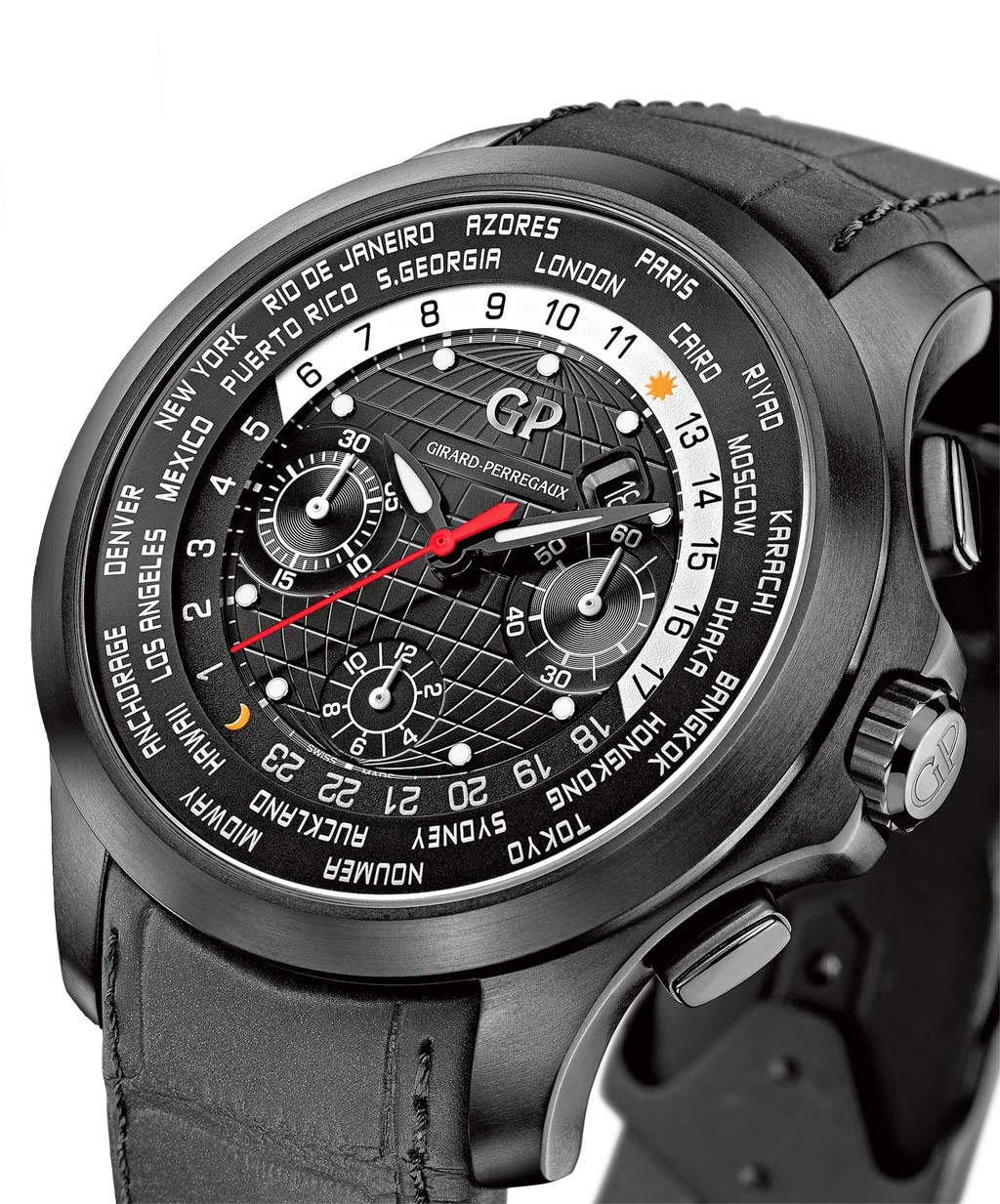 - Functions: hour, minute, small second, chronograph, date, world time with day/night indicator