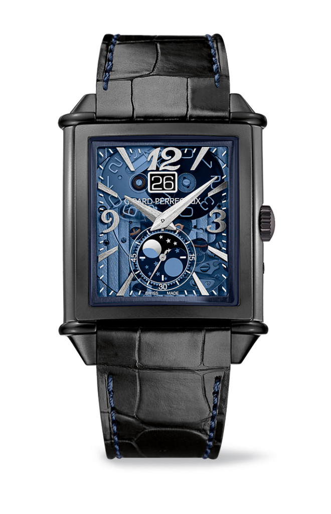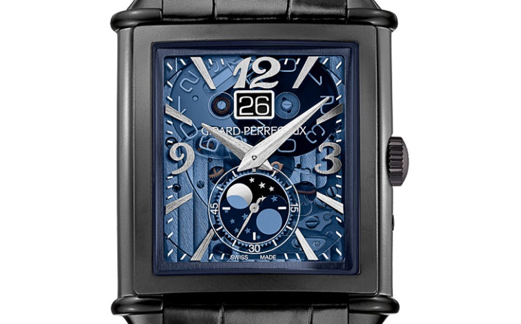 Authentic artistic icon, worthy successor of Girard- Perregaux’s history, the Girard-Perregaux Vintage 1945 XXL Large Date and Moon Phases Only Watch reveals for the first time a case in titanium DLC and a transparent dial carved in blue polycrystalline, a hint to the color of the Foundation’s logo. Its genesis is a contemporary style with perfect symmetry and a mechanical manufactured movement that all works together to create a wonderful looking piece.