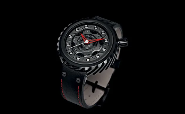 Designer Guiliano Mazzouli is known for taking inspiration from everyday objects to design variety of objects from pens to watches. The Transmission Meccanica is latest to be added to this list. Launched at the SalonQP event in 2012, the watch is designed such that each of the individual design element on the watch is made from or looks like a mechanical part from a car. Hence the case of the watch is made from the gear, the disc clutch is the dial and hands of the watch represent compass found with a mechanic. It has a 43mm stainless steel case, the crown design is similar to that of the spline shaft. The red hands are reminiscent of speedometer dial markers.