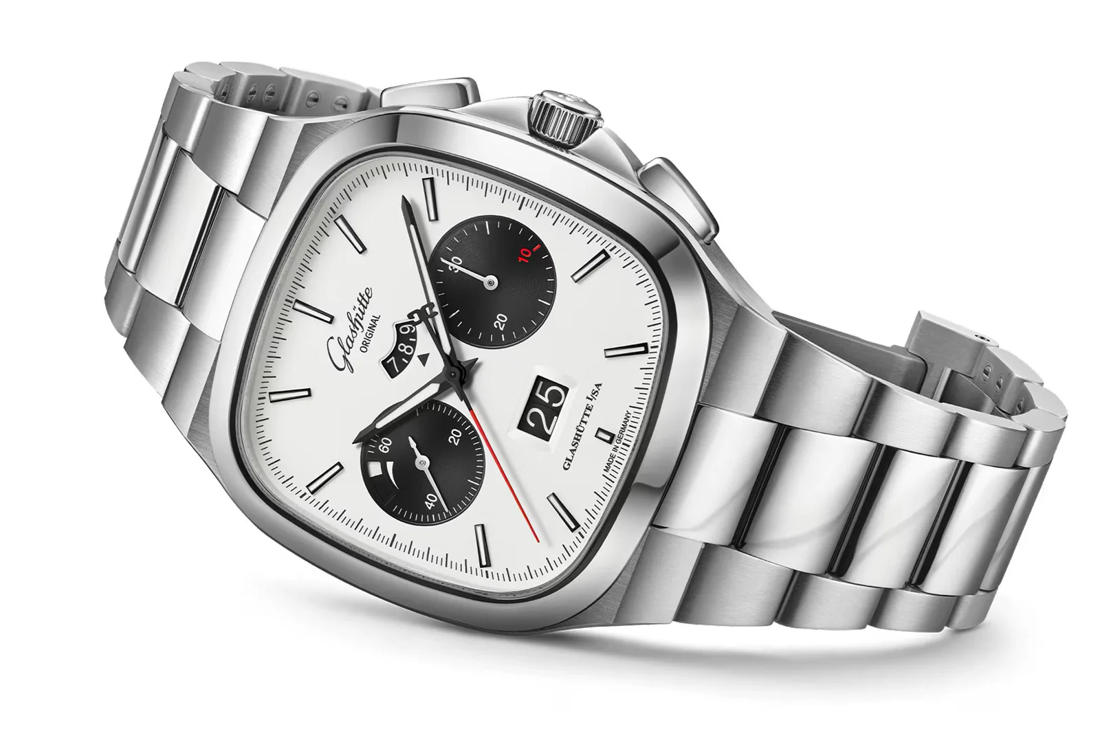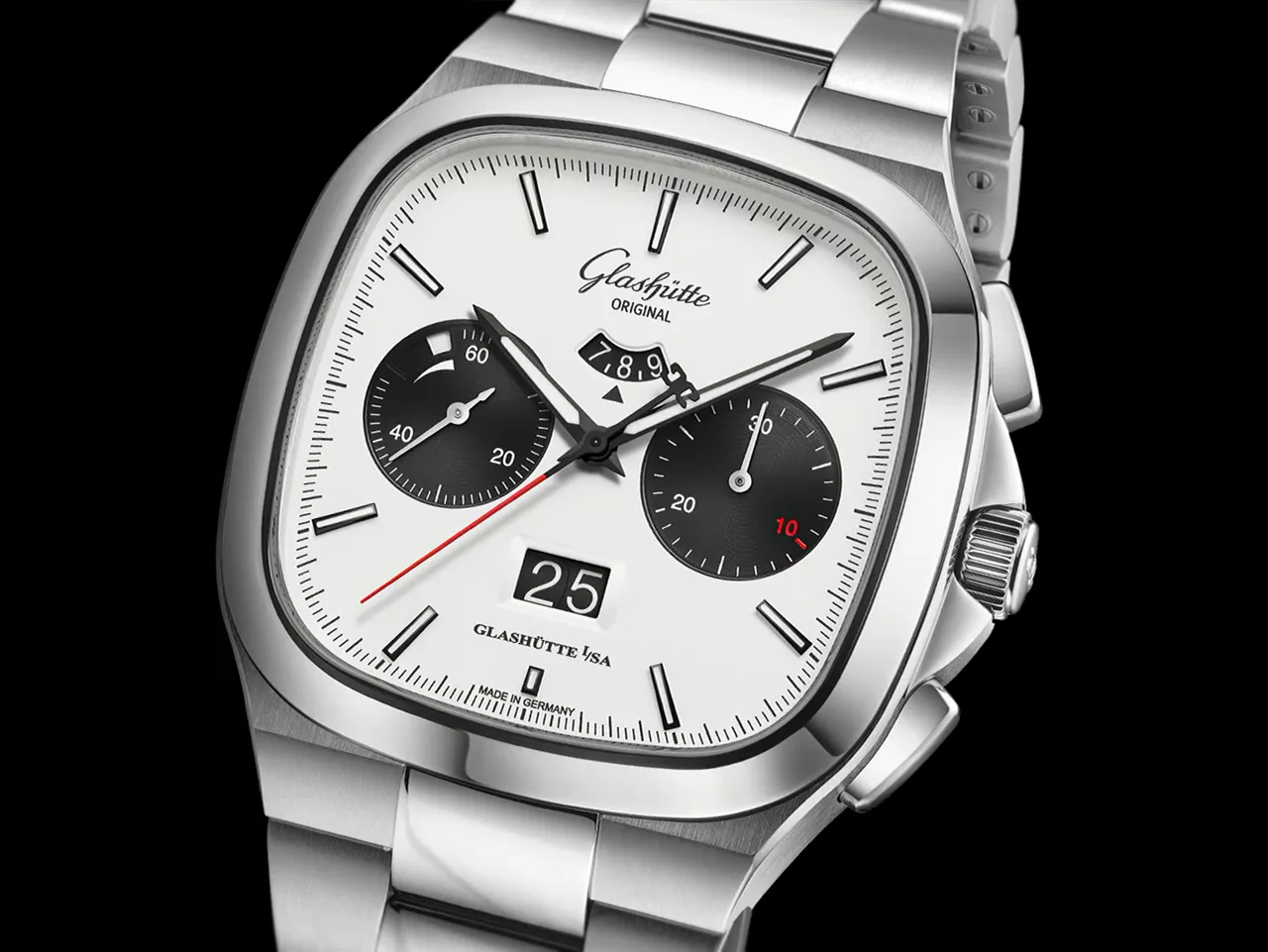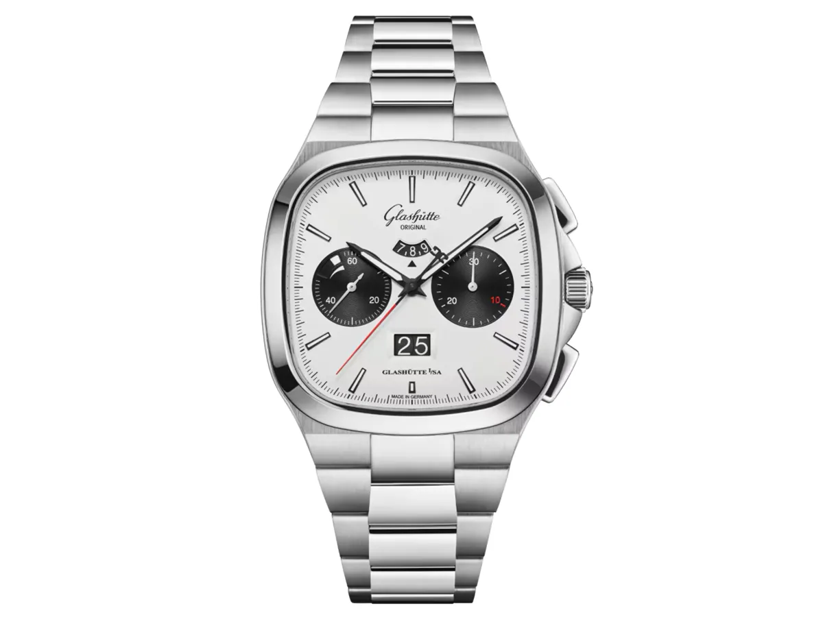 Housed in a 40mm x 14.1mm stainless steel case, the watch brings that unmistakable square cushion profile that screams 1970s, but there’s nothing outdated about this machine. The crown is flanked by two guards that melt into the chrono pushers with little fuss. Water resistance is 100 meters.