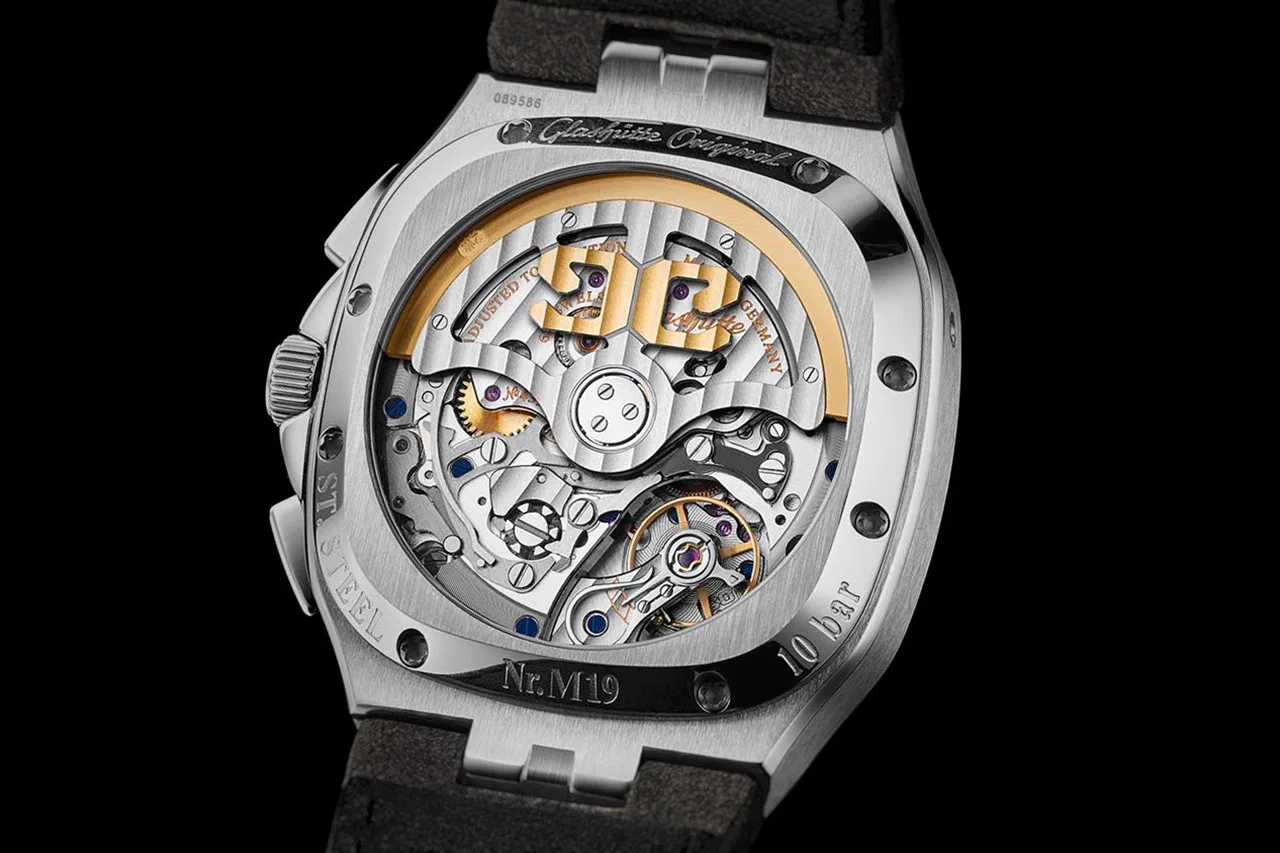 Ticking behind the curtain is the in-house Calibre 37-02, a self-winding column wheel chronograph that runs at 4 Hz and boasts a respectable 70-hour power reserve. Through the sapphire caseback, one can spy the gold-laden rotor, Glashütte stripes, blued screws, and bevelled steel components in action.