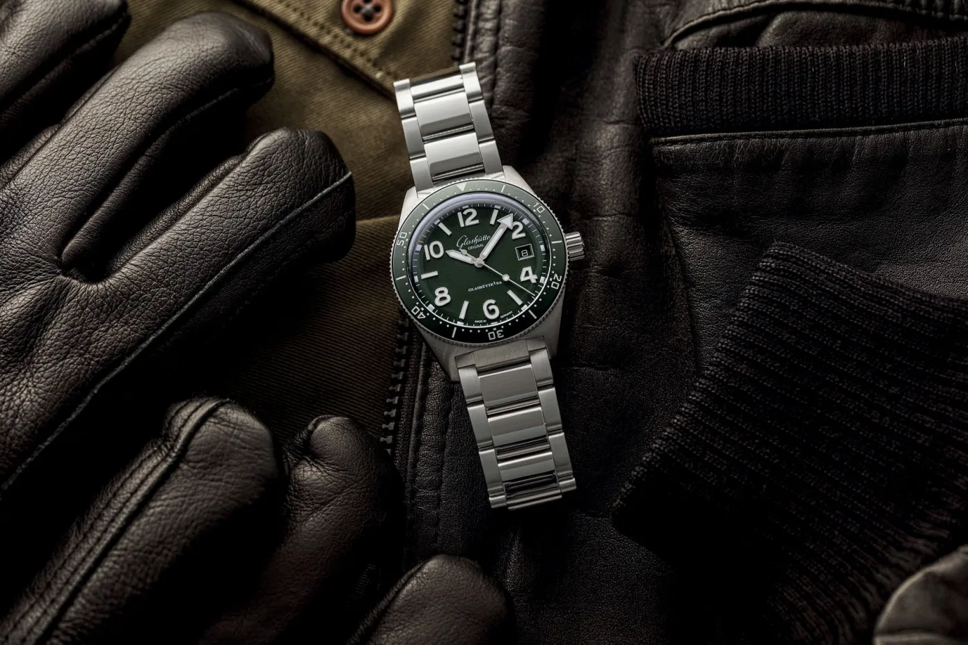 To distinguish this green variant, the sunray pattern seen on the blue version of this watch has been changed for a grainy texture with a matte finish. This ties in nicely with the markers and hands, which look modern and sharp and the green ceramic bezel with diving markings. The watch draws on some of Glashütte Original’s heritage when it comes to diving watches and has taken on the green colour very well, showing the original design’s adaptability.