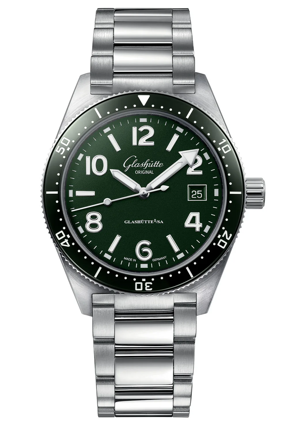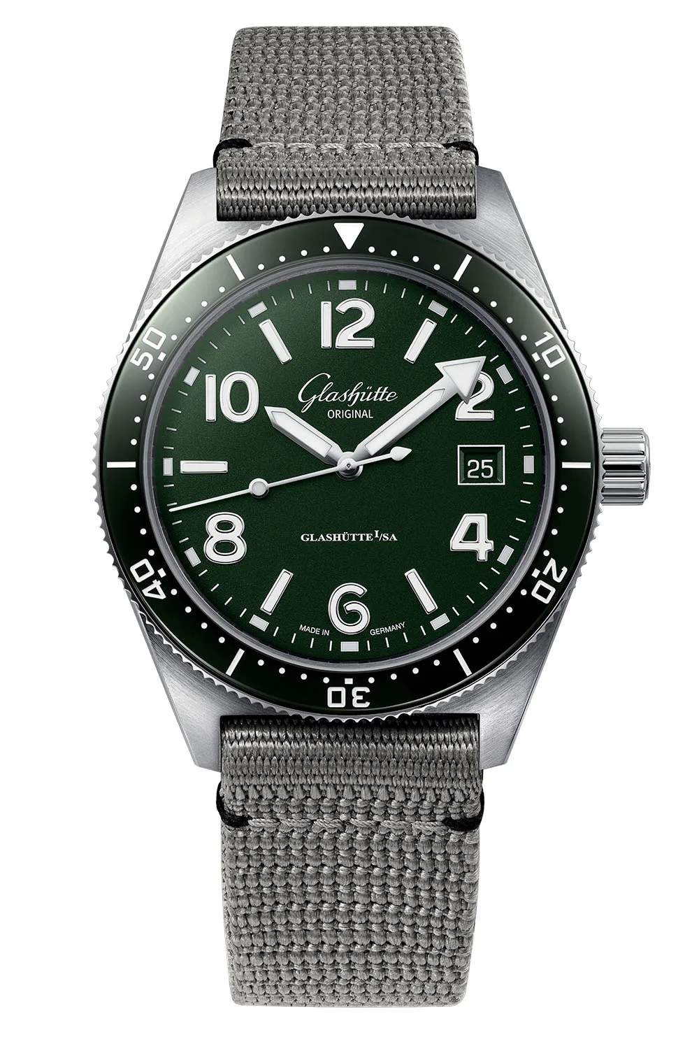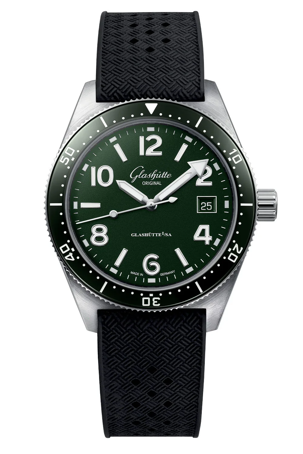 I should clarify that this is not Glashütte Original’s first foray into the colour green, they’ve done it before with their Sixties and their Seventies collections, but this one just happens to have come along at the right time. Also, this ‘Reed Green’ colour is only available on the smaller 39.5mm SeaQ, not the larger SeaQ Panorama Date model, although we could see a green variant of that one soon.