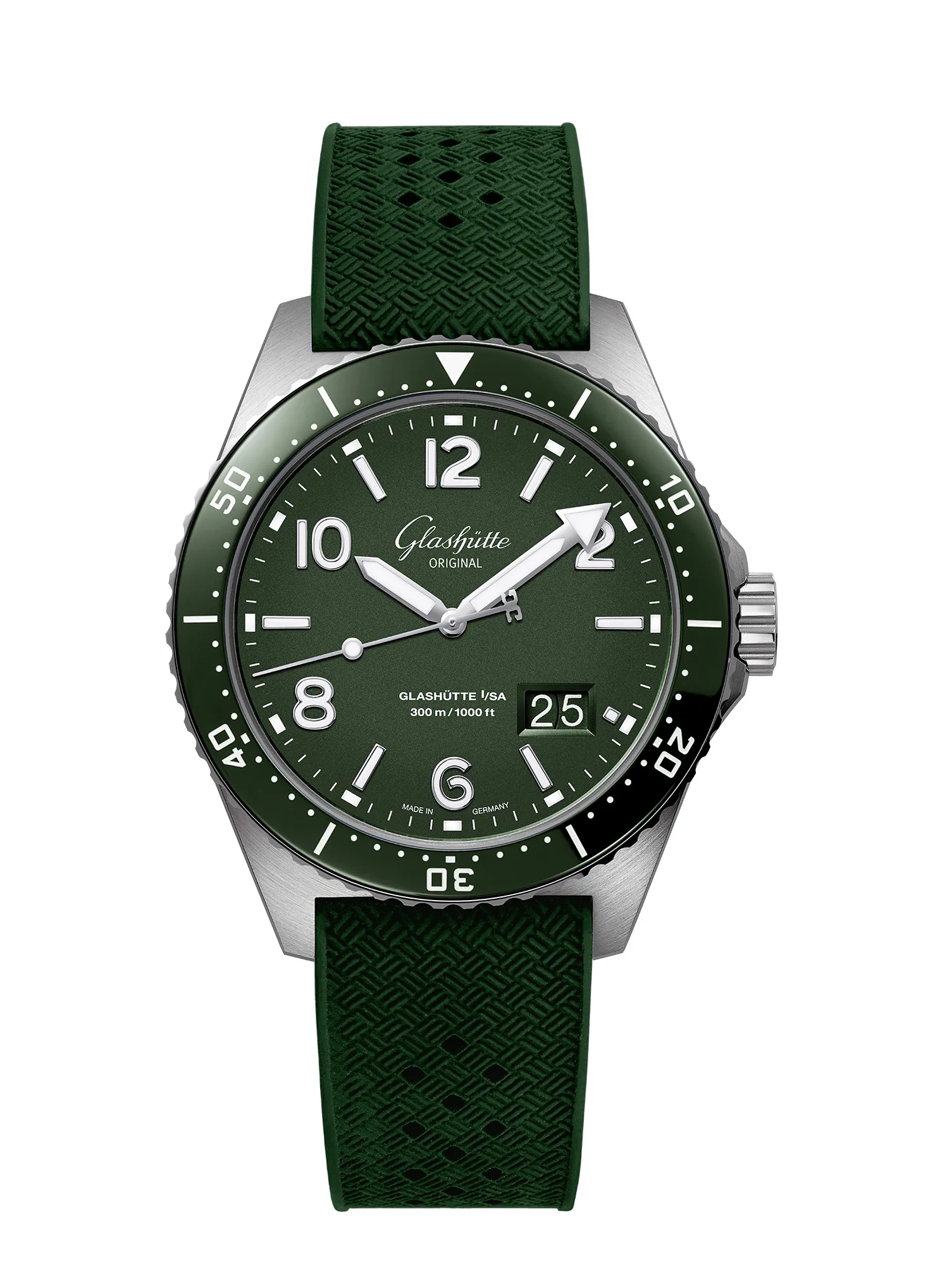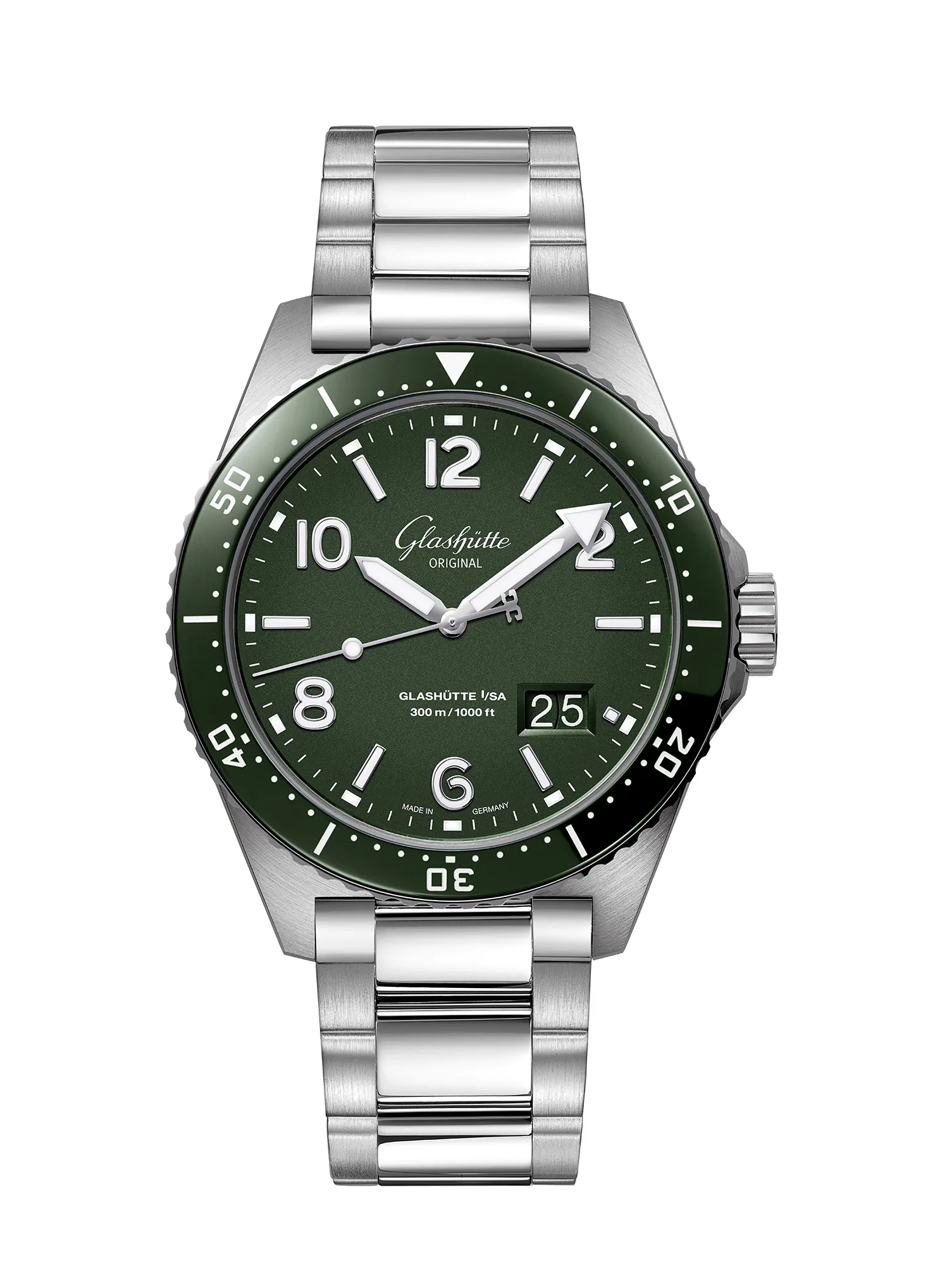 Glashütte Original introduced two very capable and stylish dive watches in 2019, the SeaQ Panorama Date and SeaQ 39.5mm. The vintage-inspired design was based on a Glashütte diver from the late 1960s, the Spezimatic Type RP TS 200. Retro divers like Blancpain’s Fifty Fathoms were clearly in the crosshairs. Purists may prefer the 39.5mm variant with a more traditional aesthetic, but the Panorama’s big date complication and larger case bring a modern touch that I appreciate. The SeaQ 39.5mm received the reed green treatment last year and now it’s the larger model’s turn, and the new color keeps the collection trendy.