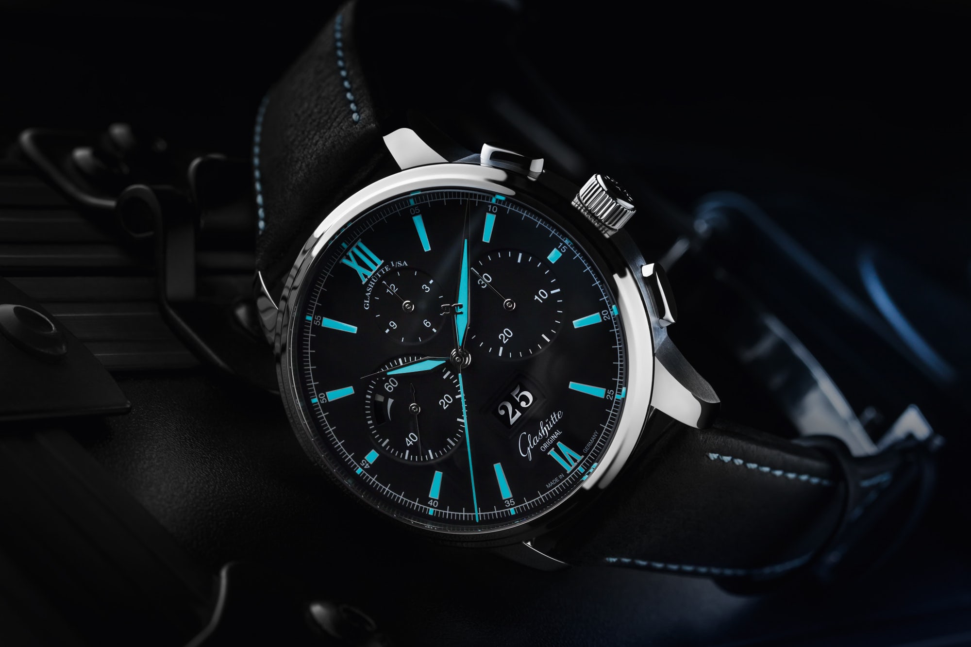 Another detail on this watch, not secretive in any way, is the date window at 6 O’clock. The date window is made up of two discs between which, unlike on other watches using a similar system, there is no difference in depth. Although, this is something you probably won’t notice without a loupe, especially considering how awesome the watch looks. Complimenting the colour theme on the dial, the black leather strap of the watch even has light blue stitching. The fact that this watch is steel means that it’s quite practical, and doesn’t require so much coddling as other dressy pieces might (don’t be too harsh, that movement is still complicated!). We love the look of it, sleek and stylish, but quite large and modern too. glashuette-original.com