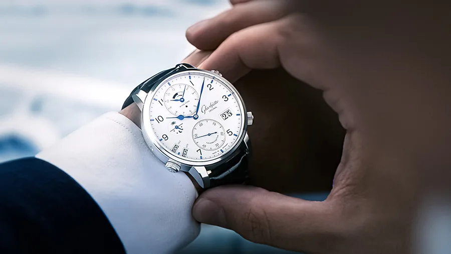 The case on this version of the Glashütte Original Senator Cosmopolite is made out of 316L stainless steel and has a diameter of 44mm. While this is certainly a large size especially considering the dressy nature of this watch, it definitely sounds acceptable if one takes into account the sheer amount of information that is on display. There is a sapphire crystal on the top as well as the back, and the case is flanked by 3 crowns at 2, 4, and 8 which are used to set the home time, the city corresponding to the local time and the big date via a corrector at 9. Water resistance is marked at 5 bars which is quite decent for a watch of this type.
