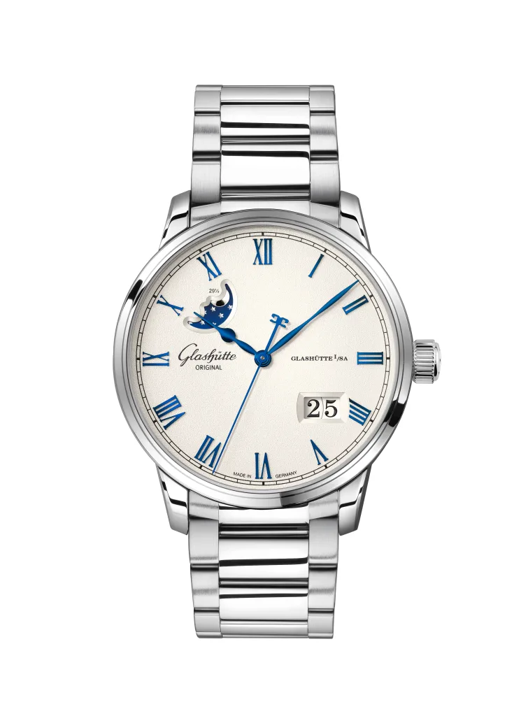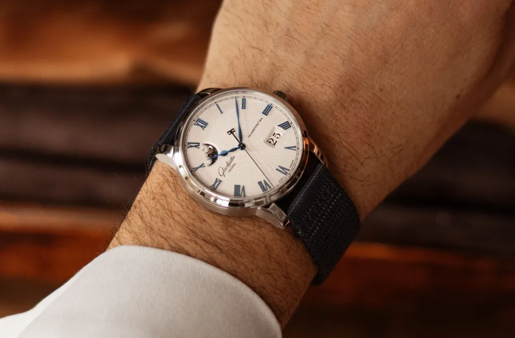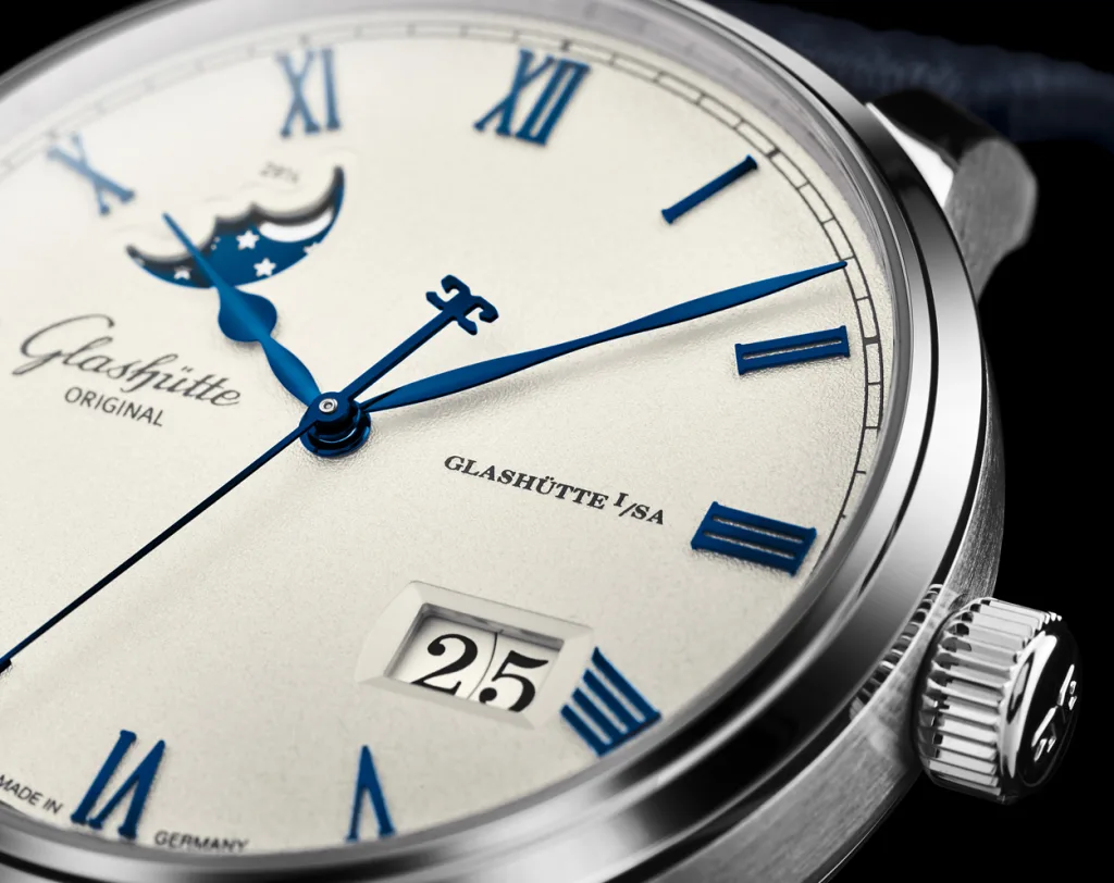 Hopping onto the dial, this is where the real magic takes place. The dial has a fine grain texture that plays with the light in a way that’s neither showy nor dull. The Roman numerals and hands are in blued steel, adding just enough contrast to make reading the time easy on the eyes. The moon phase sits neatly at 10 o’clock with a playful moon and stars, while the brand’s signature Panorama date is perched at 4 o’clock. The silver variant keeps the same layout but feels brighter and a bit more casual thanks to its clean backdrop. In keeping with the Senator Excellence‘s understated design, the Roman numerals function as hour markers, encouraging minute estimations for a clean, uncluttered dial.