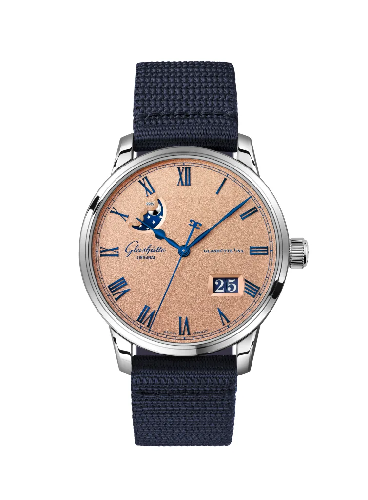 As for the strap you got options, both the “frosted silver” and “frosted copper” variants are paired with a dark blue Louisiana alligator leather strap; classic and dressy; with the additional option of a blue synthetic fabric strap that feels a bit more casual and sporty without going overboard. Both straps fasten with either a pin buckle or a stainless steel folding clasp. Price-wise, you’re looking at a price bracket which firmly places it in the high-end luxury segment. Availability is through Glashütte Original boutiques and authorized retailers.