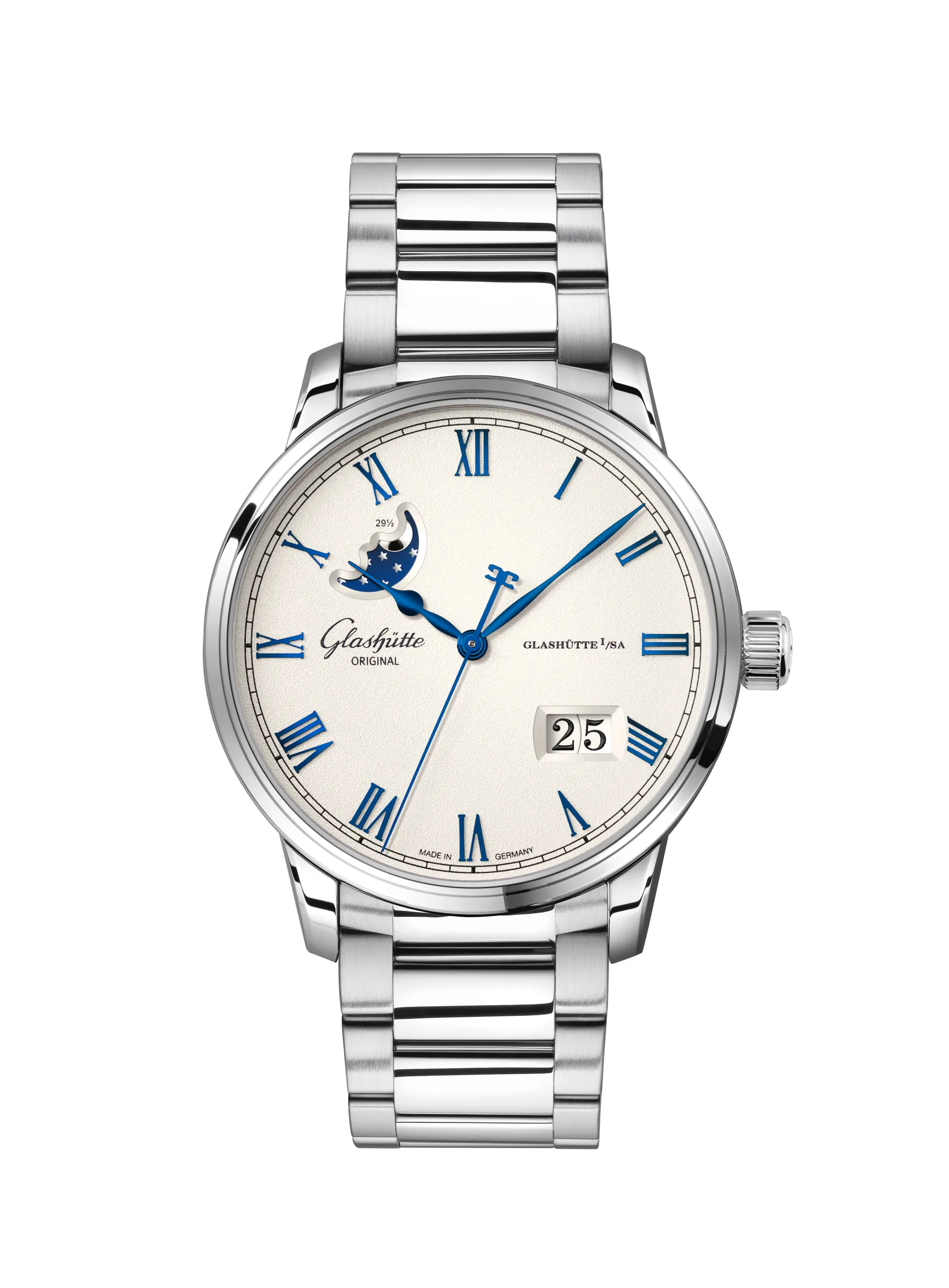 Hopping onto the dial, this is where the real magic takes place. The dial has a fine grain texture that plays with the light in a way that’s neither showy nor dull. The Roman numerals and hands are in blued steel, adding just enough contrast to make reading the time easy on the eyes. The moon phase sits neatly at 10 o’clock with a playful moon and stars, while the brand’s signature Panorama date is perched at 4 o’clock. The silver variant keeps the same layout but feels brighter and a bit more casual thanks to its clean backdrop. In keeping with the Senator Excellence‘s understated design, the Roman numerals function as hour markers, encouraging minute estimations for a clean, uncluttered dial.