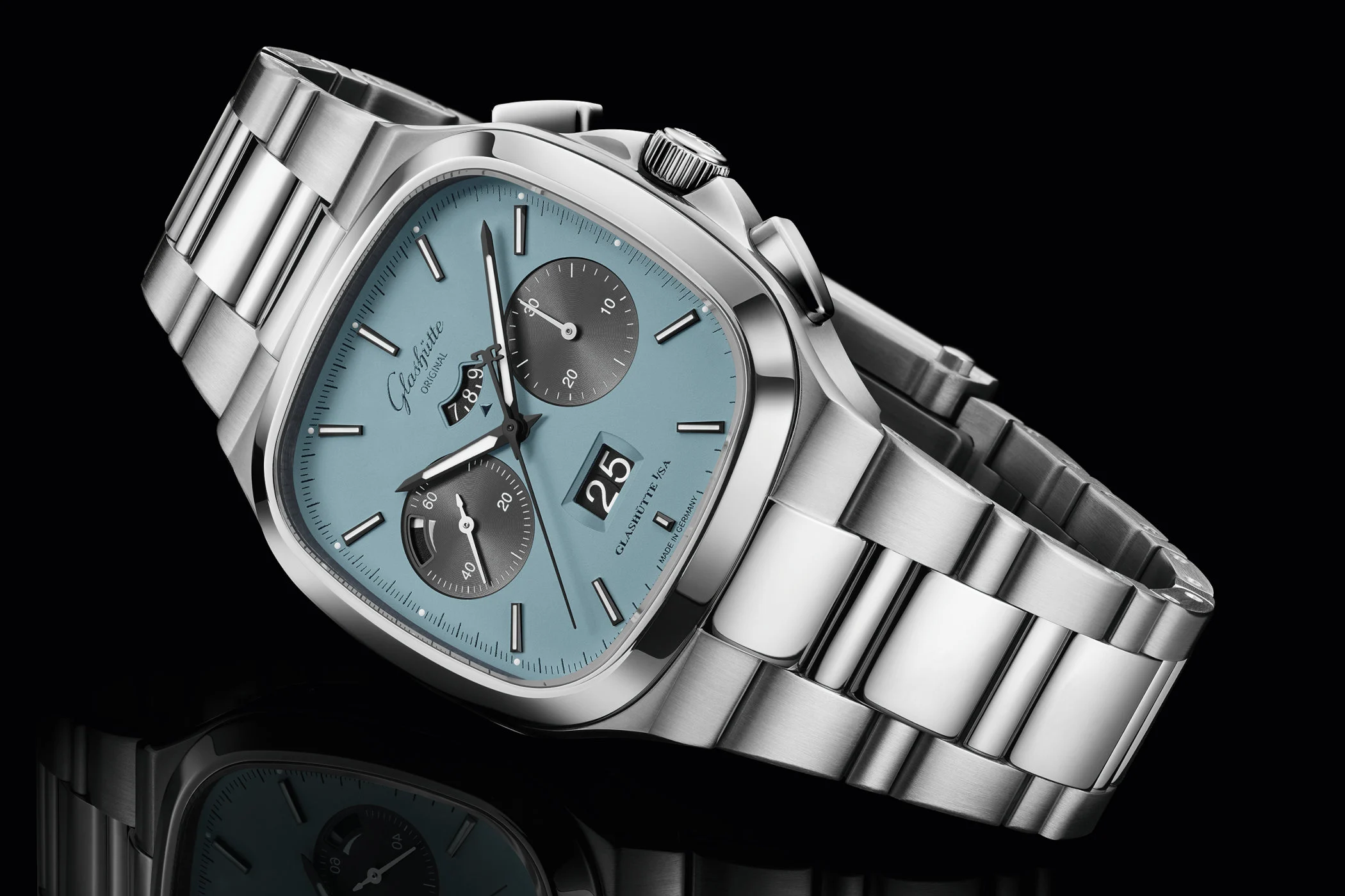 The signature Seventies-style case of the Seventies Chronograph Panorama Date is made of stainless steel and measures 40mm in diameter. It is water-resistant to 100 meters and features a screw-down crown protected by two guards and a screw-down caseback.