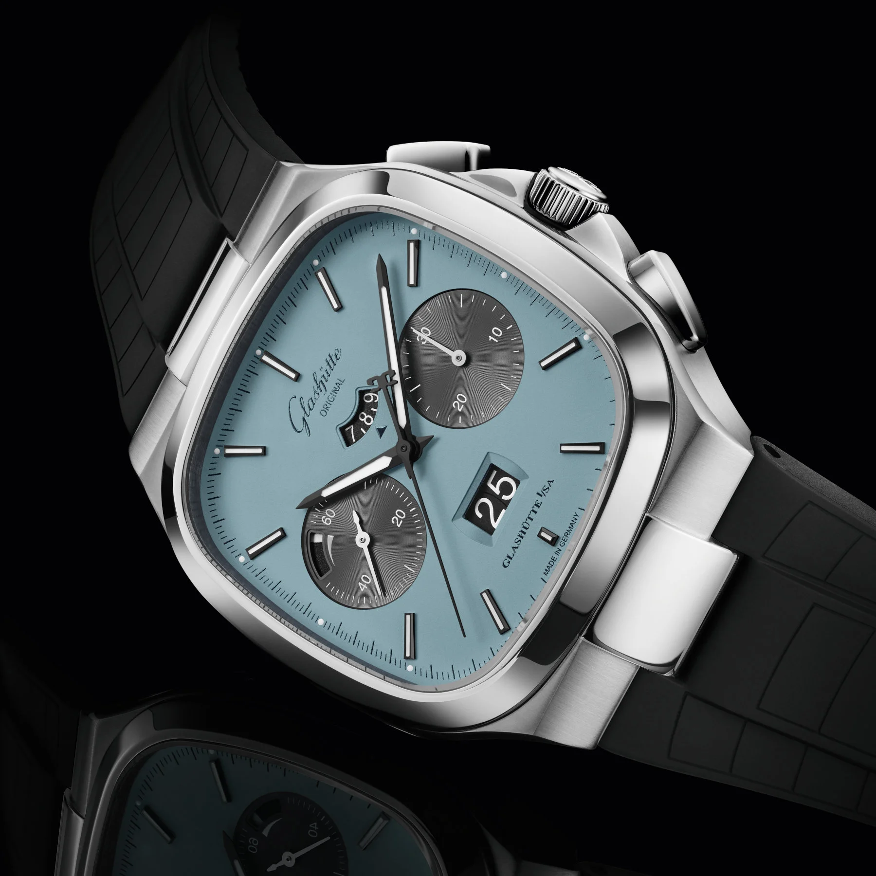 The Seventies Chronograph Panorama Date is powered by the in-house Caliber 37-02 automatic movement, which has a power reserve of 70 hours and is decorated with Glashütte stripes, perlage, and blued screws.