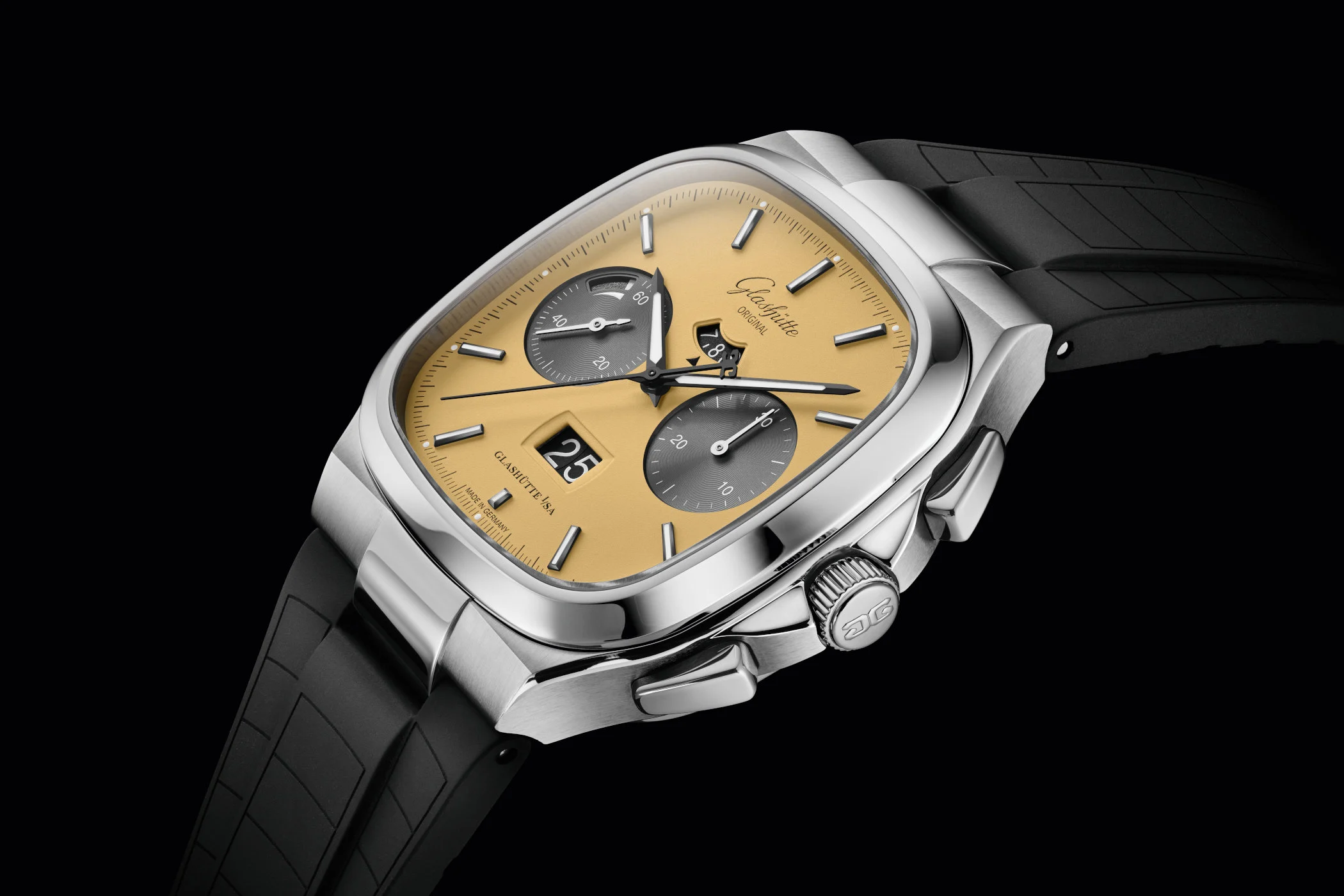 The Seventies Chronograph Panorama Date is available with either a stainless steel bracelet or a rubber strap. The price is €17,200 with the bracelet and €16,000 with the rubber strap.
