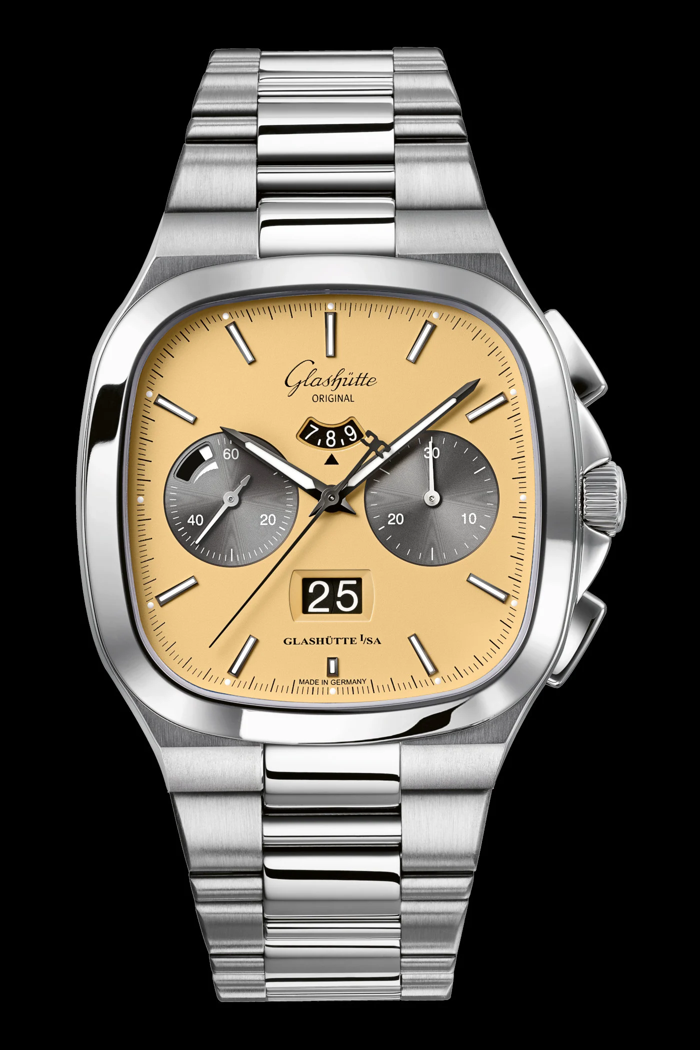 The signature Seventies-style case of the Seventies Chronograph Panorama Date is made of stainless steel and measures 40mm in diameter. It is water-resistant to 100 meters and features a screw-down crown protected by two guards and a screw-down caseback.
