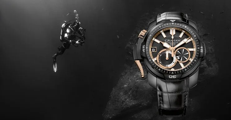 The Graham Prodive Black and Gold Limited Edition is ran by the 25 jeweled, 28,800 vph(4 Hz) Graham caliber G1750 automatic mono-pusher chronograph movement with a 48 hours power reserve. The 45 mm black DLC case is holds a domed sapphire crystal in the front and a shark stamped and limited edition serial number on the case back. Around the case sits the unidirectional bezel. Inside the case we have two sub-dial displaying the second counter and 30 minute, minute counter. For more info, please visit graham1695.com