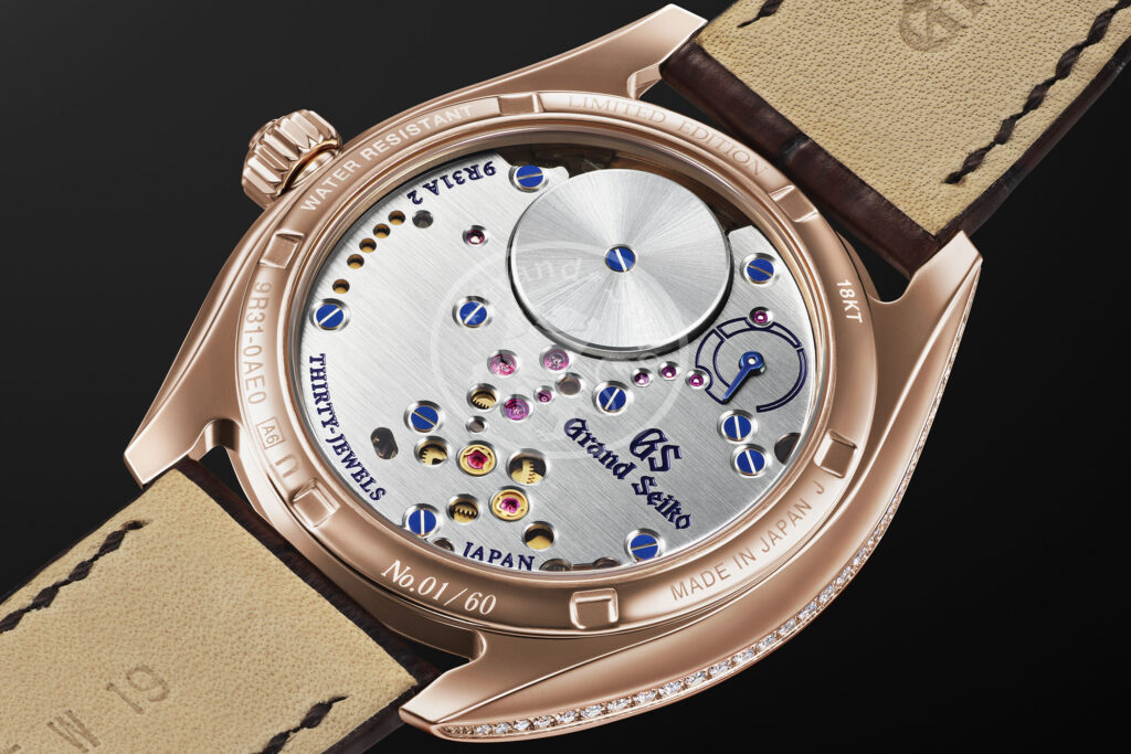 Visible from the sapphire crystal on the rear of the watch is the hand-wound caliber 9R31. This movement has a refined industrial finish and features flamed blued screws and a power reserve indicator with a blue hand. Like other Spring drive movements, the 9R31 offers a power reserve of 72 hours and is accurate to ±1 second per day.