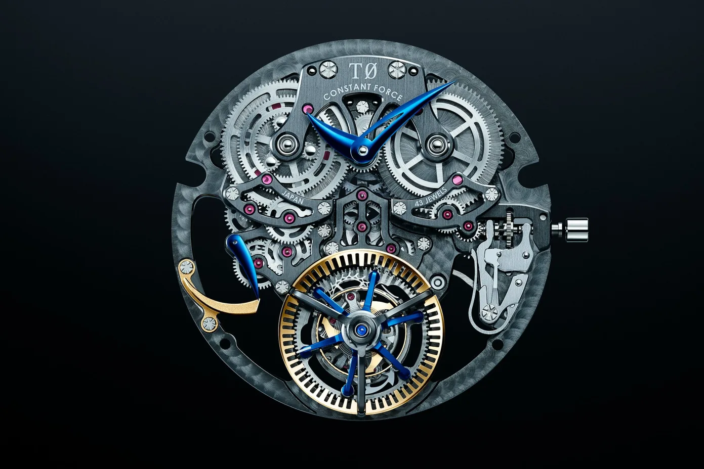 In the case of the new T0 Constant Force movement, the remontoire has been integrated into the tourbillon assembly. Here is an explanation by the team leader for the project, Mr. Takuma Kawauchiya: As the outer carriage turns, it charges the constant force spring connecting the outer and inner carriage, and the charged energy will drive the inner tourbillon carriage. A pallet stone ‘stopper’ attached to the inner carriage which meshes with the teeth of the stop wheel [which is made of ceramic] is used to control the distribution of energy from the constant force spring, and as energy of the constant-force spring is released, the energy is supplied to the inner carriage that drives the escape wheel that meshes with the stationary wheel. The escape wheel now supplies constant and uniform energy to the balance. While the inner carriage is rotating, the outer carriage is stopped by the engagement of the stopper and the stop wheel. When the inner carriage rotates by six degrees, the engagement of the stopper and the stop wheel is released and the outer carriage rotates to provide energy to the constant force spring. When the outer carriage rotates by six degrees, the next tooth of the stop wheel engages the stopper and the outer carriage stops again. This sequence of movements takes place in one-second cycles, so that the second hand makes deadbeat motion.