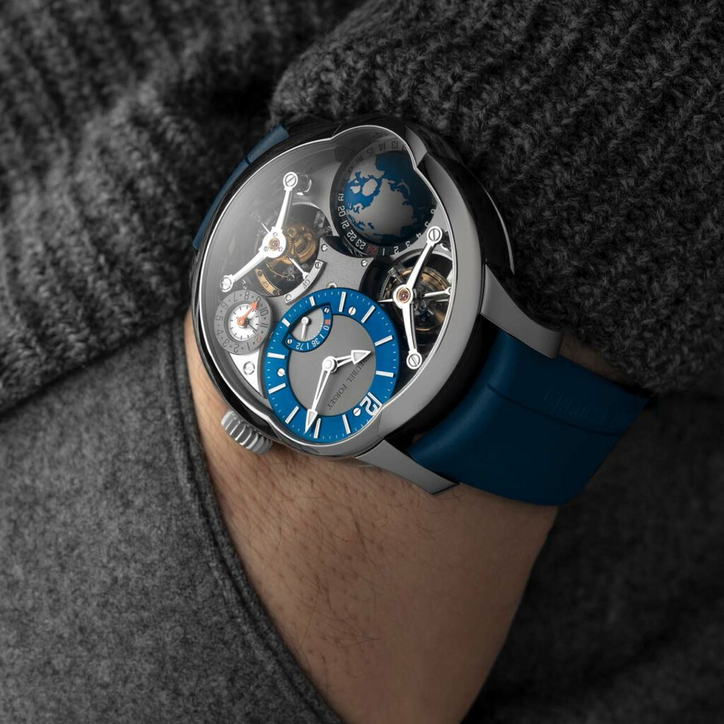 The latest in Greubel Forsey’s collection is a reworking of a model they introduced in 2019 called the GMT Quadruple Tourbillon. For 2021, Greubel Forsey presents the next version of the GMT Quadruple Tourbillon with a titanium case and some new colours.