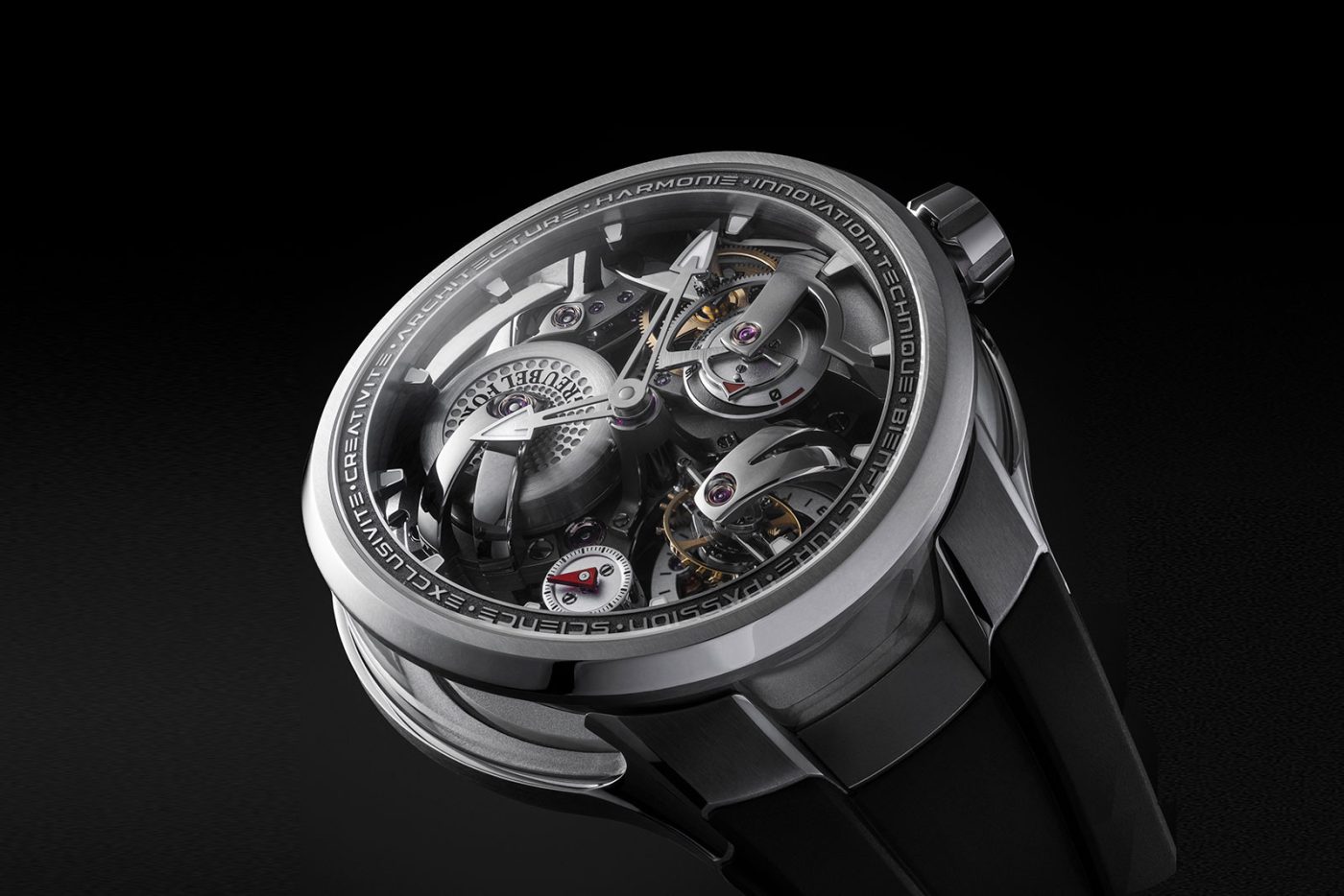 Once you’re past that, this new Greubel Forsey is a lot easier to understand. The titanium case can, from some angles, look odd, but it’s been designed to be comfortable to wear and showcase the movement within. Apart from the ellipse shape it seems to take on from some angles, the most striking thing about it is its sapphire crystal caseband, allowing a view through the side of the watch to the inner workings. The wording around the dial is intriguing, an homage to the influences of the watch and the drivers of the team at Greubel Forsey in general. Another oddity of the design is that the case is wider at the bottom (47.05mm) than at the top (45mm), allowing it to fit the big movement while appearing smaller. The thickness is 16.8mm, and it has a water resistance of 50m.