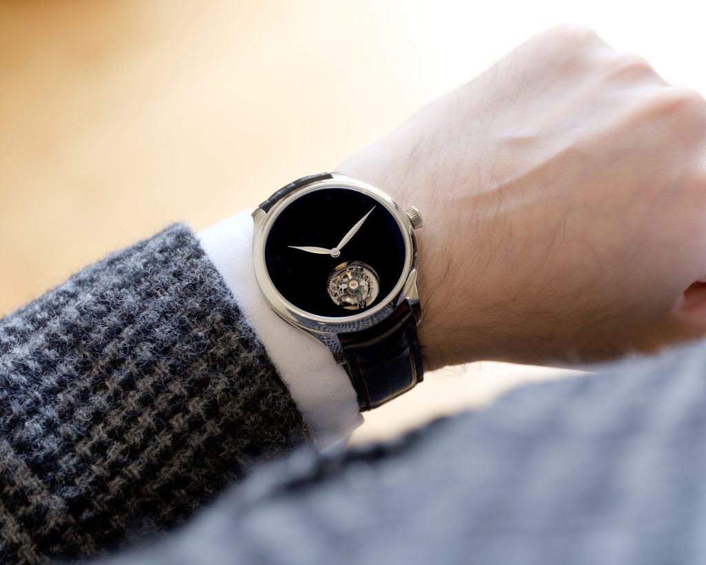The Moser’s tourbillon adds another degree of complexity, as it is a flying tourbillon. This means that there isn’t a bridge across the top to support it, it’s only being held in place by the mount at the back of the tourbillon which also supplies the power. To aid this bearing’s longevity and increase the power reserve of the watch the tourbillon cage, cage wheel, balance bridge and escapement bridge are all crafted from aluminium, though the balance wheel and hairspring are not made from futuristic materials such as these. It also serves as a little reminder that you probably have other things to be doing instead of losing yourself in the Vantablack dial.