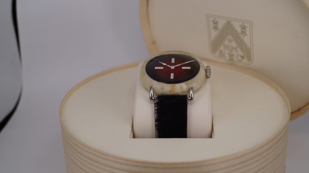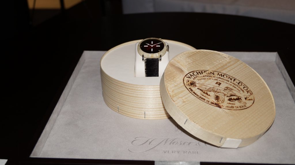 Fast forward to SIHH 2017 and H. Moser finally revealed the most Swiss watch ever, the H. Moser & Cie Swiss Mad (yes that is mad as in insane or crazy). As you will probably immediately notice from the photos, the case is not steel. But what is it? Is it marble? Is marble typical Swiss? No. It’s cheese. The case of the Swiss Mad watch is made of Swiss cheese. The idea was that since the watch needed to be 100% Swiss Made, the case couldn’t be made out of steel, because that steel would most likely come from somewhere else. So to make sure the watch case was Swiss Made, and to be sure to generate a lot of attention, H. Moser made the case out of Swiss cheese. The cheese has been processed and other materials have been added in to create a hard, non-smelly and rugged case.