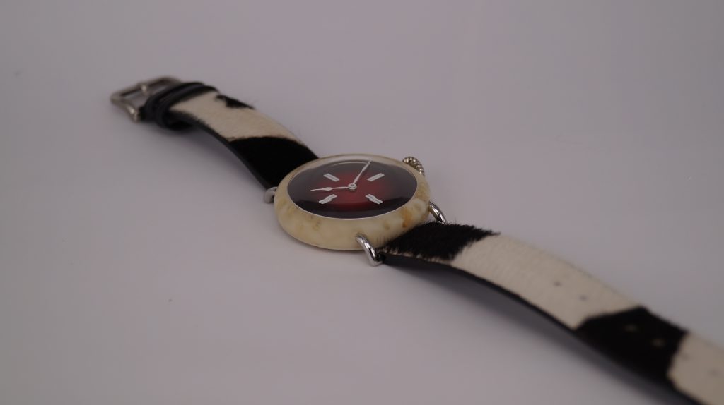 The mo(o)vement is the typical H. Moser three day manually wound calibre HMC 327 which, as usual, is beautifully finished with vertical Geneva stripes. The dial, although it does not say ‘Swiss made’ anymore, is still very much Swiss, as can be seen by the huge white markers on the red fumé dial that looks like a Swiss flag from the right angle.