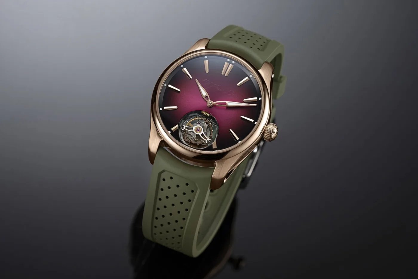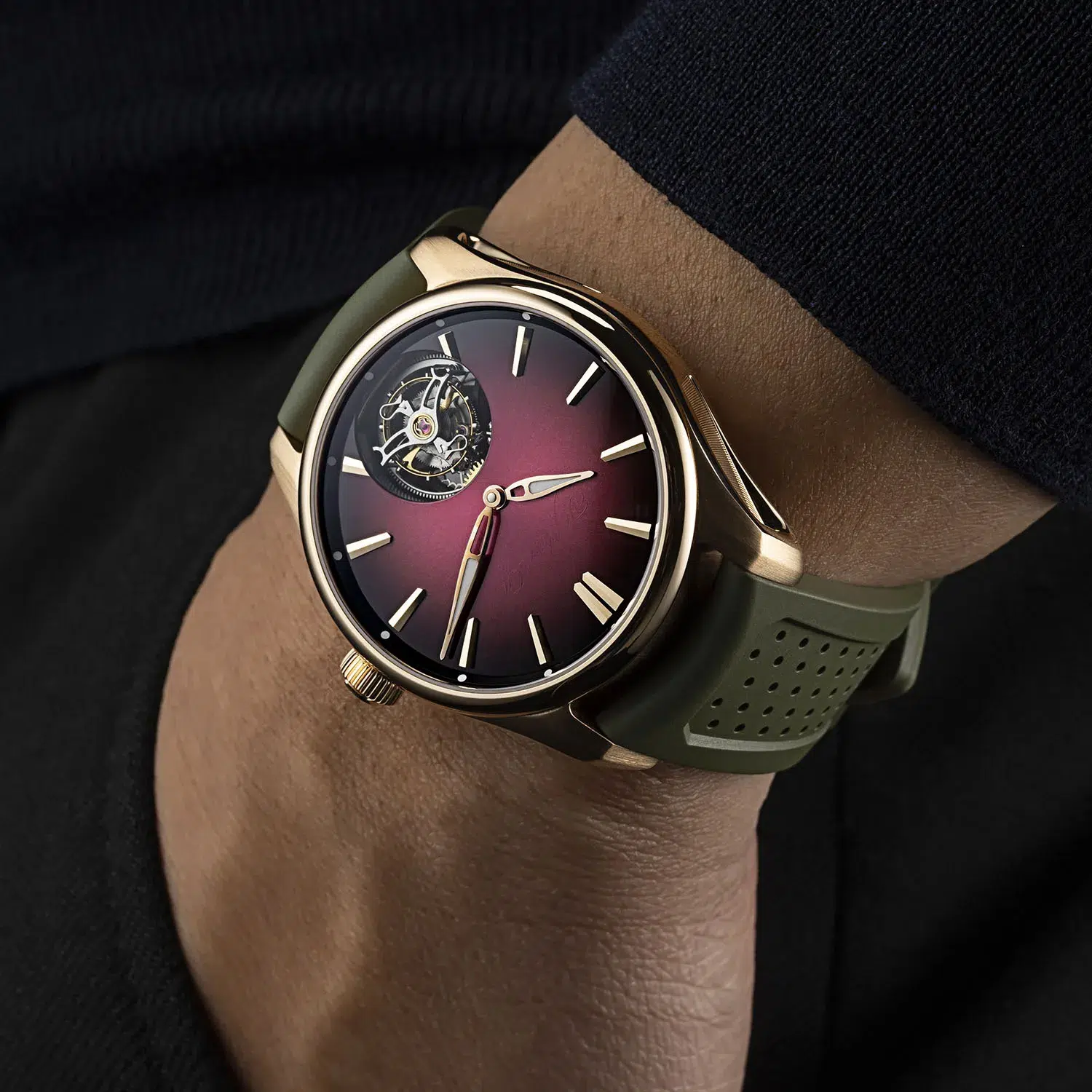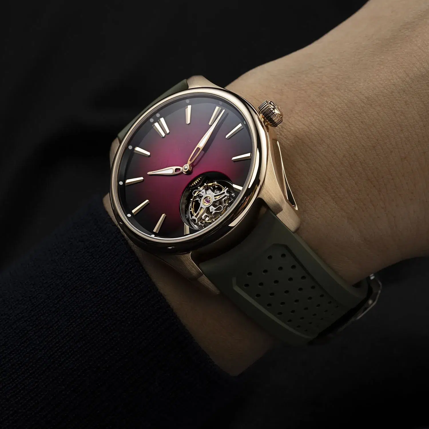 Pioneer Tourbillon Burgundy sports a dial with a dazzling burgundy fumé effect that enables the dial transitioning from a lighter center to a darker periphery. A sunburst pattern enhances the dial’s texture and that of the fumé effect. A subtle touch is the brand’s logo, subtly applied in transparent lacquer, maintaining a clean aesthetic.