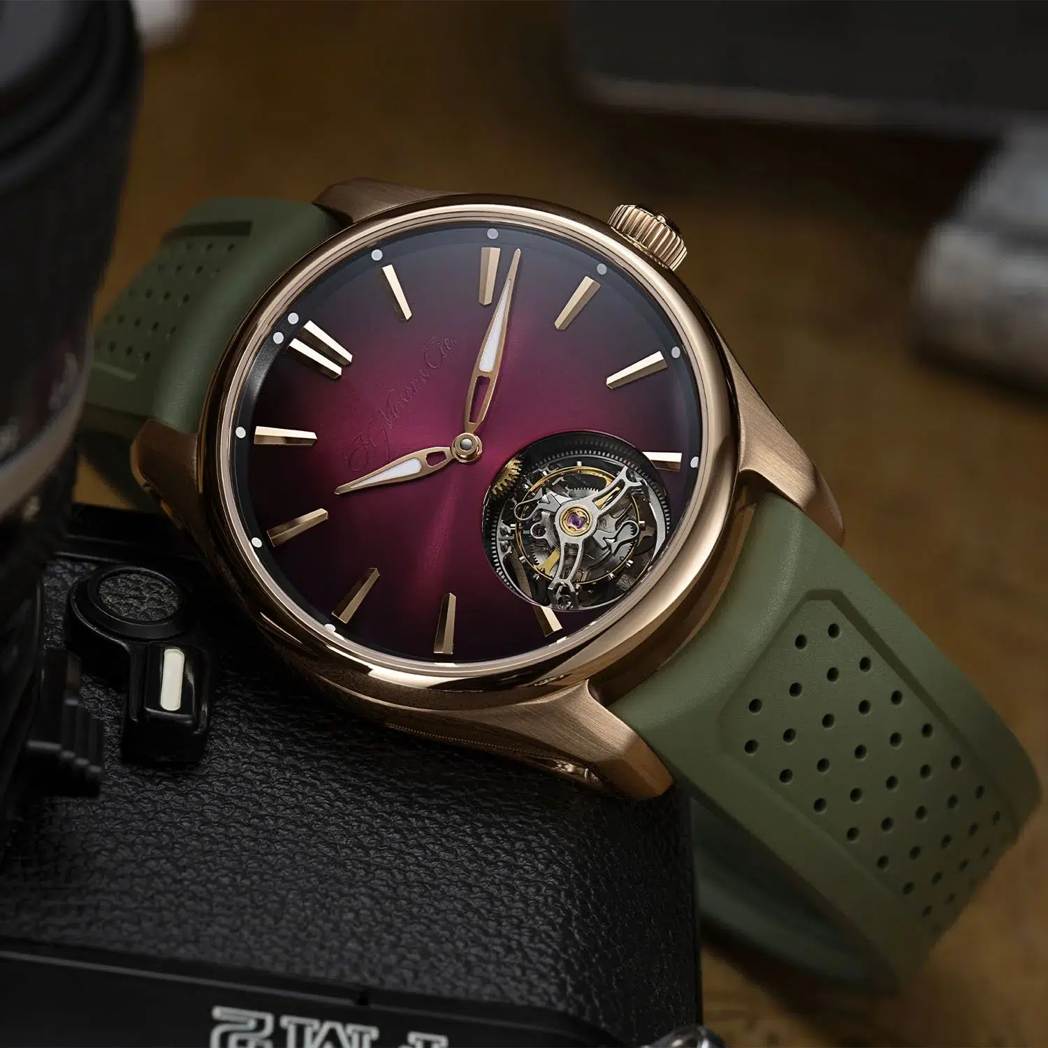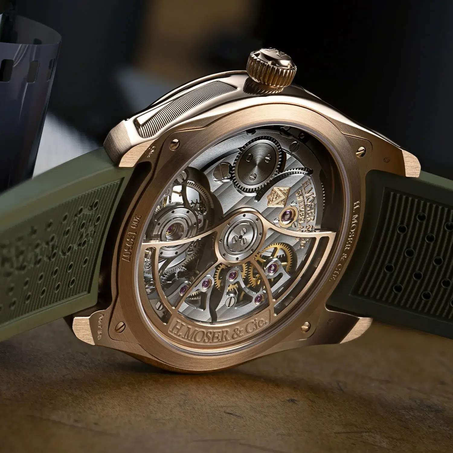 Powering the watch is the in-house Calibre HMC 805, an automatic movement with a 3-day power reserve. A revised version of the HMC 804, with openworked bridges, an anthracite grey finish with Moser double stripes and a skeletonized 18k red gold rotor.