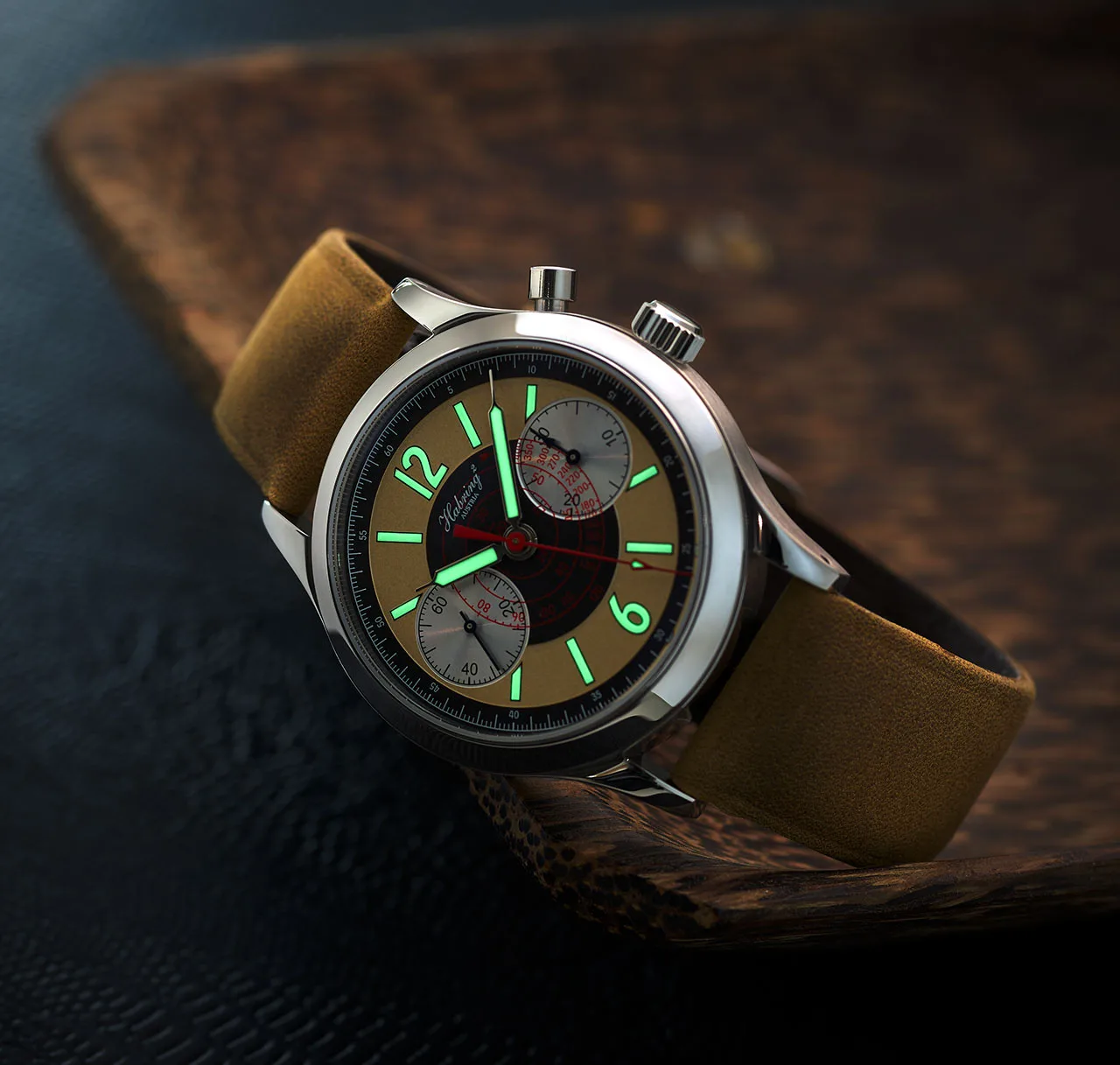 On the dial side, you get a familiar highly legible bi-compax layout that is seen on previously released versions of the Chrono Felix. However, the folks at Habring have made some great design and color choices to give this new variant a sporty feel. To begin with, the base dial has been presented in a mix of salmon and black, which is offset by the two silver counters and a bright red spiral tachymeter scale at the center. The hour markers are a combination of batons and Arabic numerals at 12 and 6 and have been coated with luminous paint to aid low light legibility. An elaborate minute/chronograph seconds track runs on the outer periphery. The lume filled syringe style hour and minute hands combined with the red arrow tipped chronograph hand accentuate the sporty vibe of the watch, whereas the blued hands on the sub-registers bring in a dash of elegance.